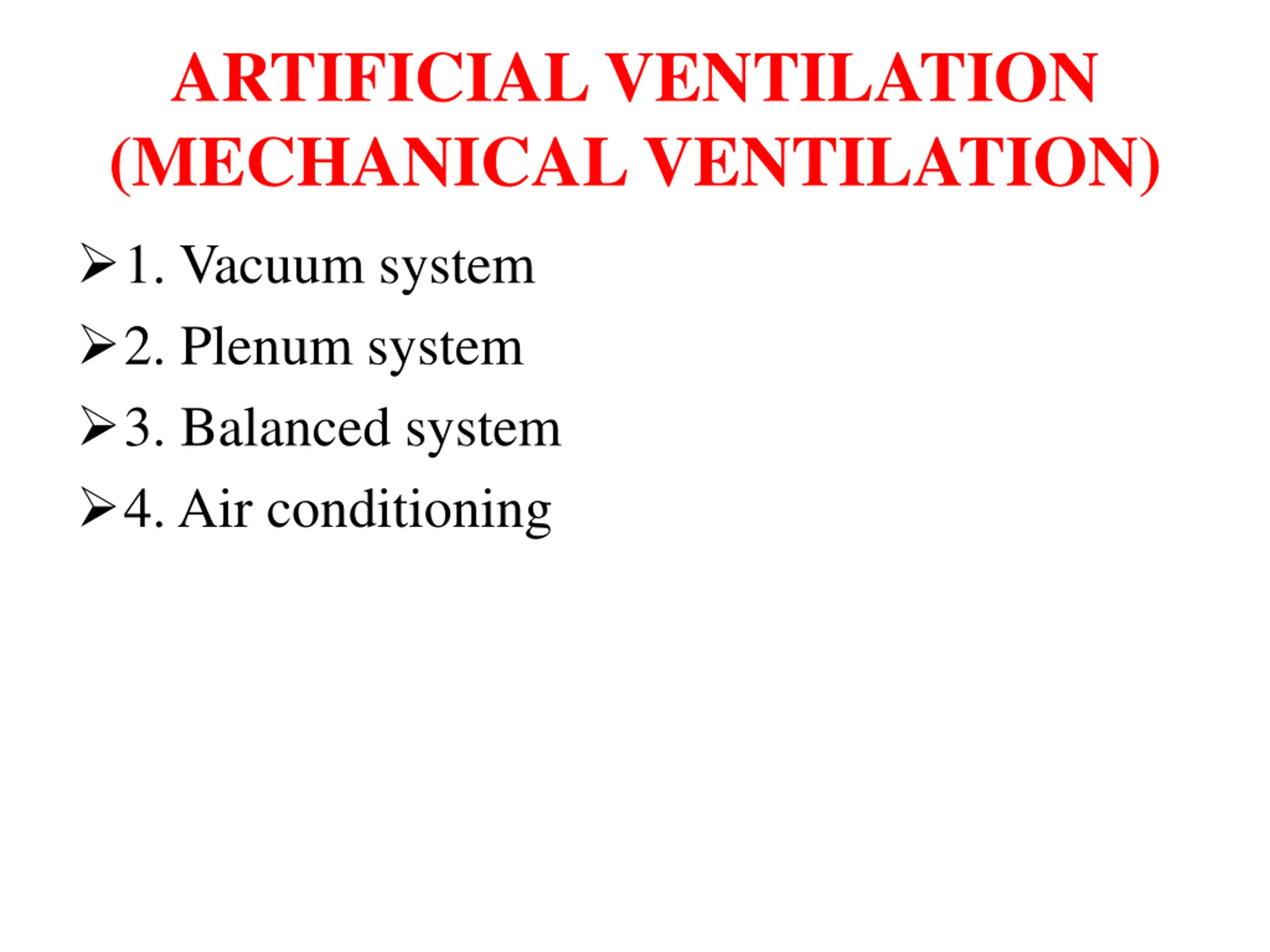 ARTIFICIAL VENTILATION (MECHANICAL VENTILATION) 1. Vacuum system 2. Plenum system 3. Balanced system 4. Air conditioning