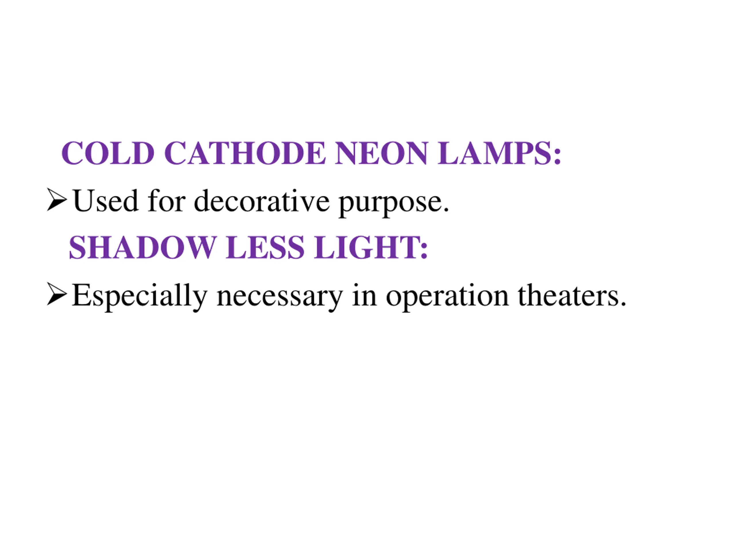 COLD CATHODE NEON LAMPS: Used for decorative purpose. SHADOW LESS LIGHT: Especially necessary in operation theaters.