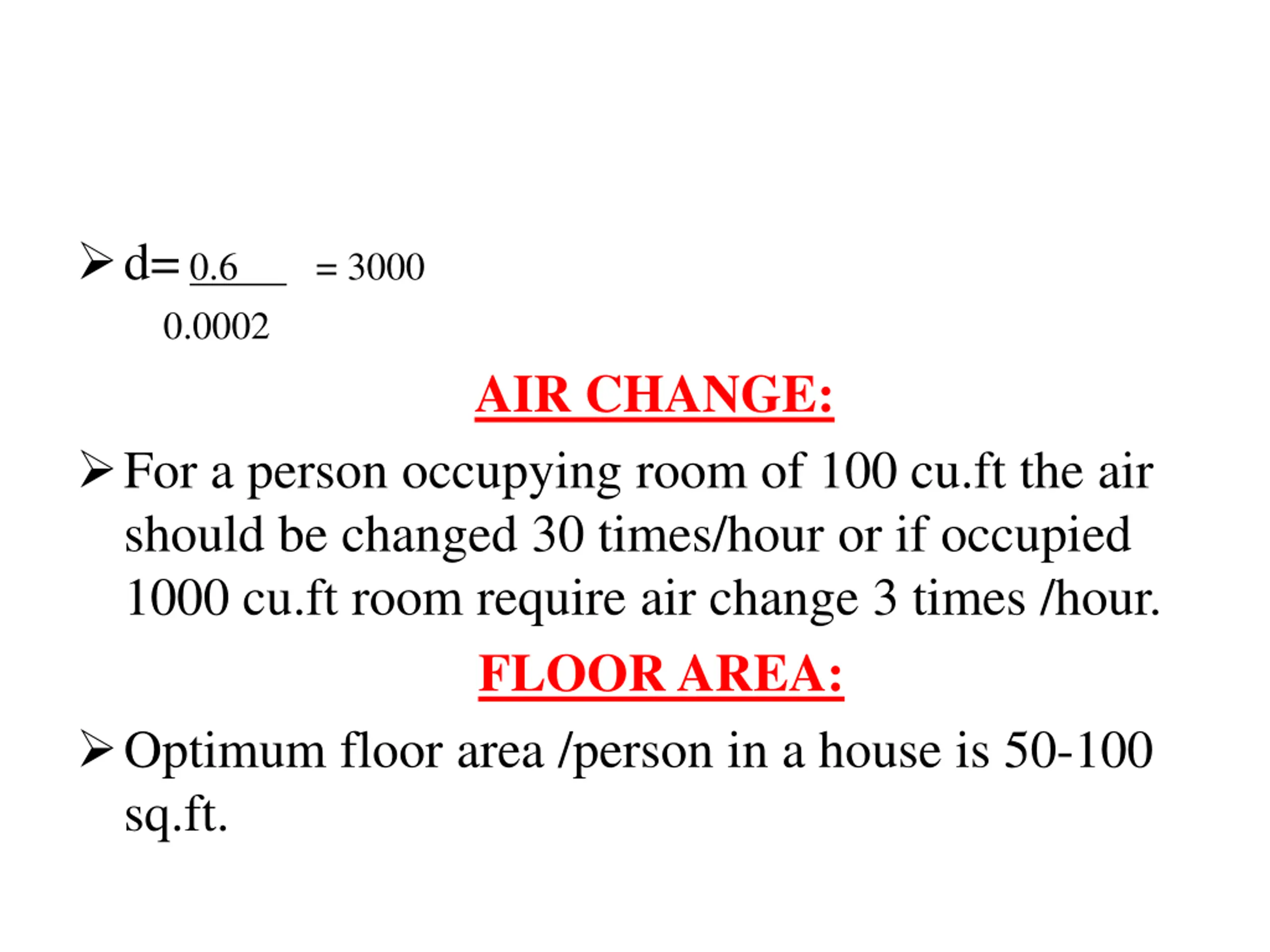 d= 0.6 = 3000 0.0002 AIR CHANGE: For a person occupying room of 100 cu.ft the air should be changed 30 times/hour or if occupied 1000 cu.ft room require air change 3 times /hour. FLOOR AREA: Optimum floor area /person in a house is 50-100 sq.ft.