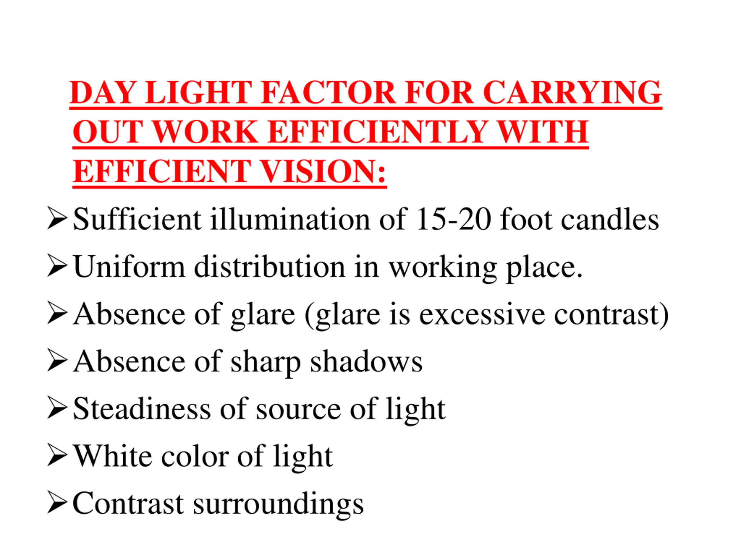DAY LIGHT FACTOR FOR CARRYING OUT WORK EFFICIENTLY WITH EFFICIENT VISION: Sufficient illumination of 15-20 foot candles Uniform distribution in working place. Absence of glare (glare is excessive contrast) Absence of sharp shadows Steadiness of source of light White color of light Contrast surroundings