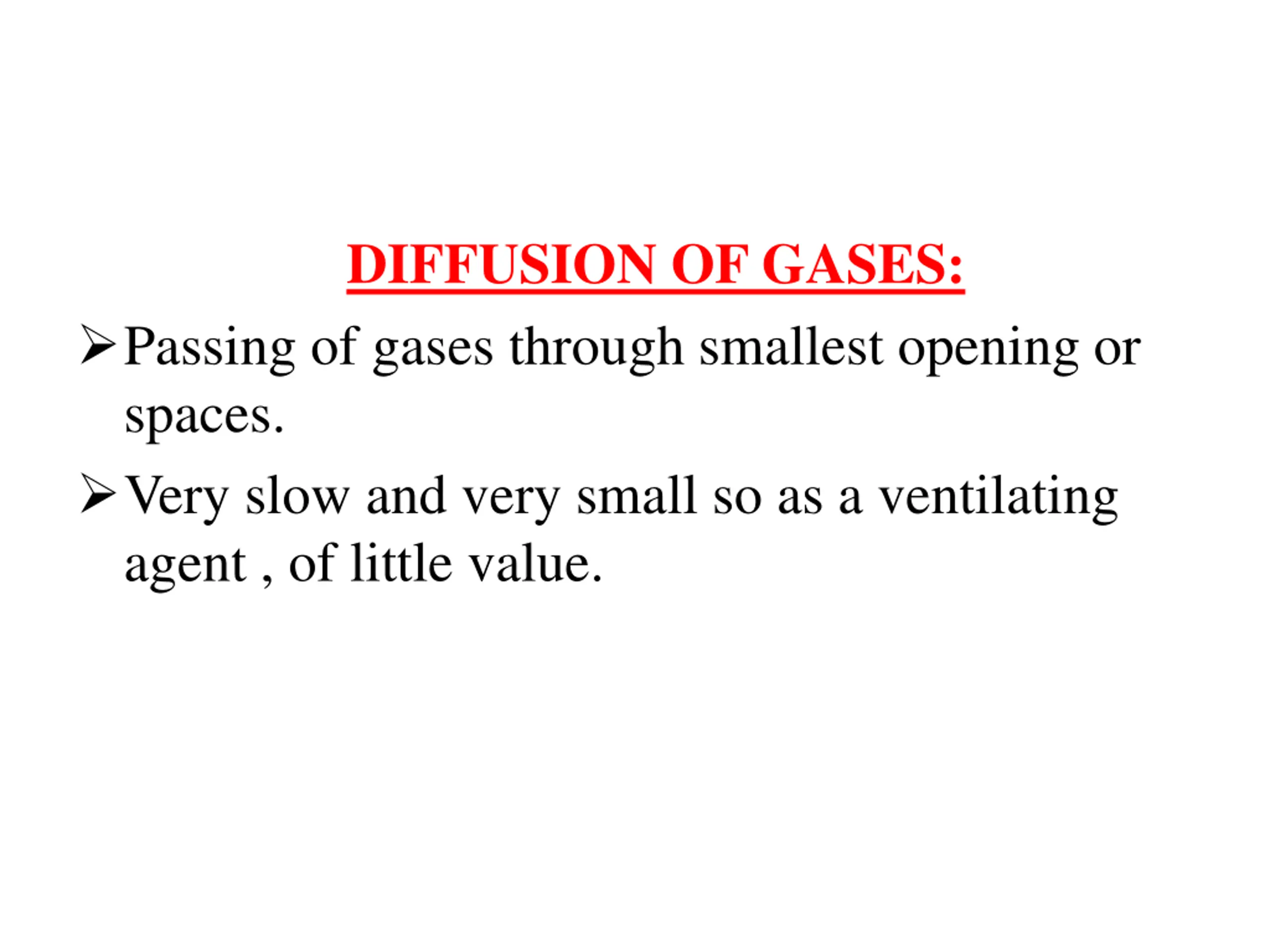 DIFFUSION OF GASES: Passing of gases through smallest opening or spaces. Very slow and very small so as a ventilating agent , of little value.
