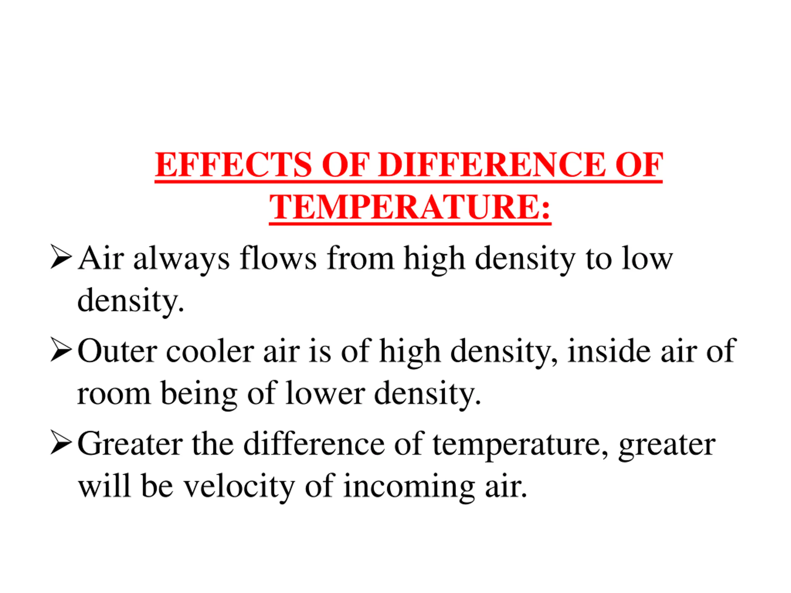 EFFECTS OF DIFFERENCE OF TEMPERATURE: Air always flows from high density to low density. Outer cooler air is of high density, inside air of room being of lower density. Greater the difference of temperature, greater will be velocity of incoming air.