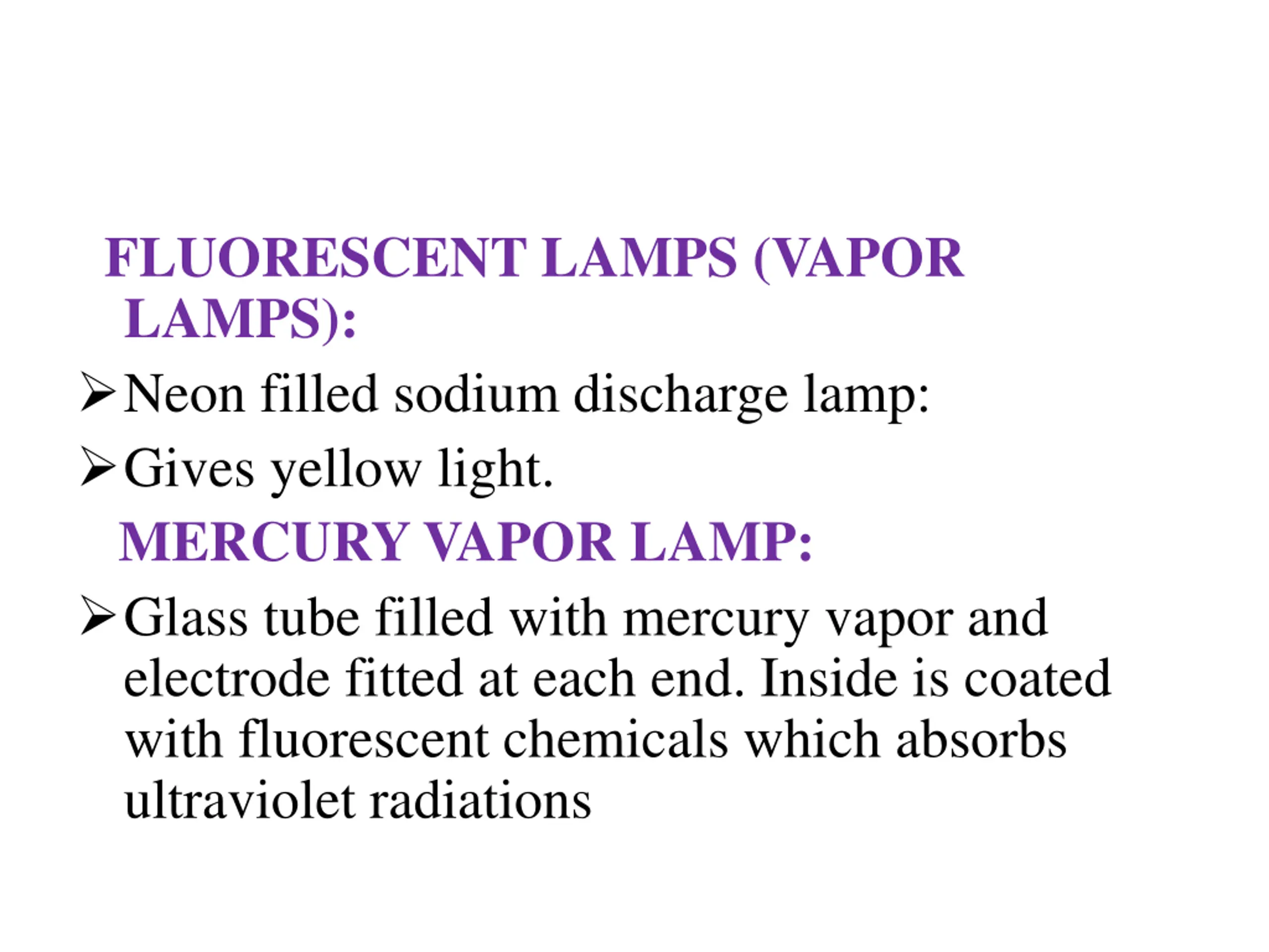 FLUORESCENT LAMPS (VAPOR LAMPS): Neon filled sodium discharge lamp: Gives yellow light. MERCURY VAPOR LAMP: Glass tube filled with mercury vapor and electrode fitted at each end. Inside is coated with fluorescent chemicals which absorbs ultraviolet radiations
