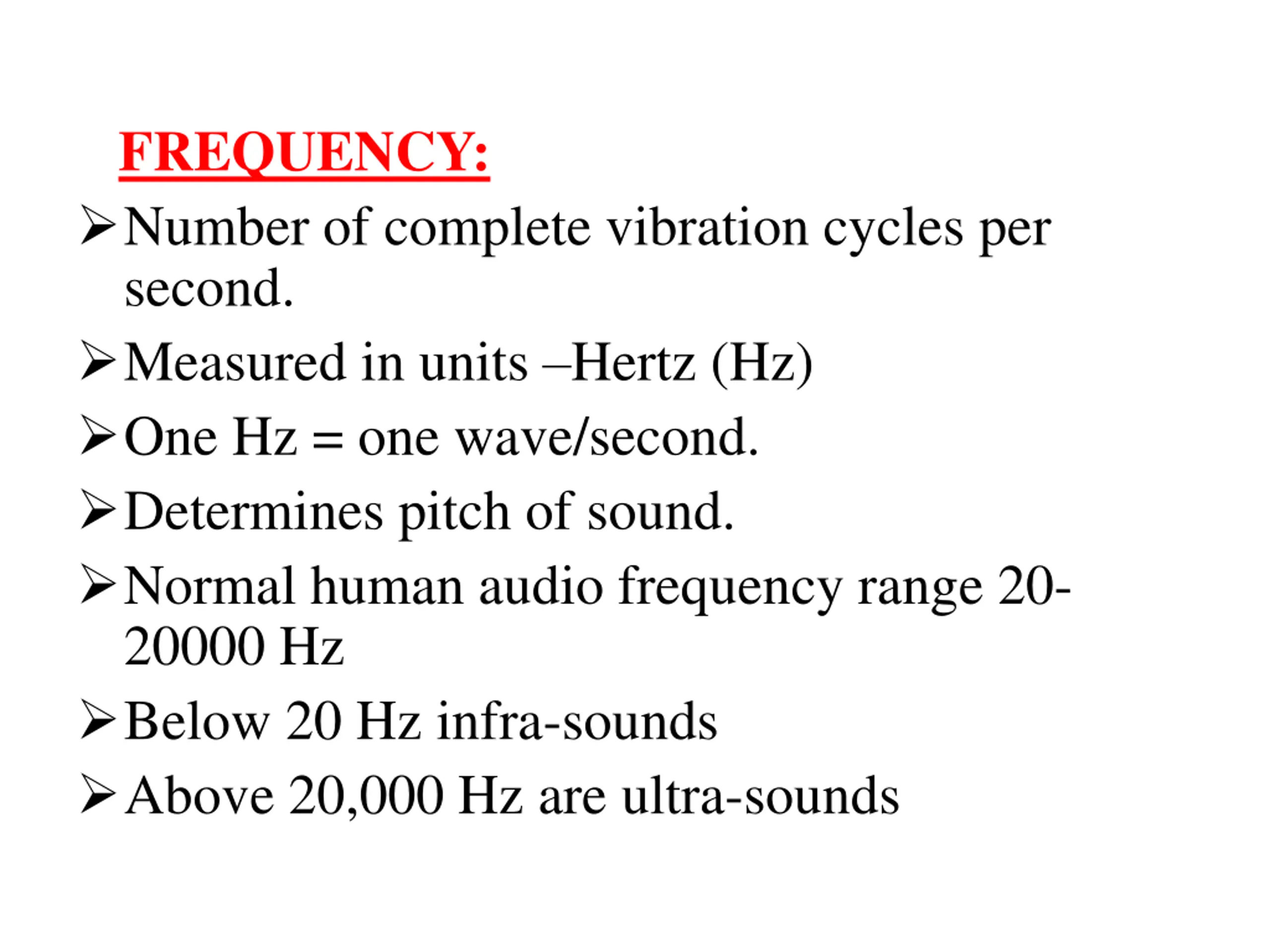 FREQUENCY: Number of complete vibration cycles per second. Measured in units Hertz (Hz) One Hz = one wave/second. Determines pitch of sound. Normal human audio frequency range 20- 20000 Hz Below 20 Hz infra-sounds Above 20,000 Hz are ultra-sounds
