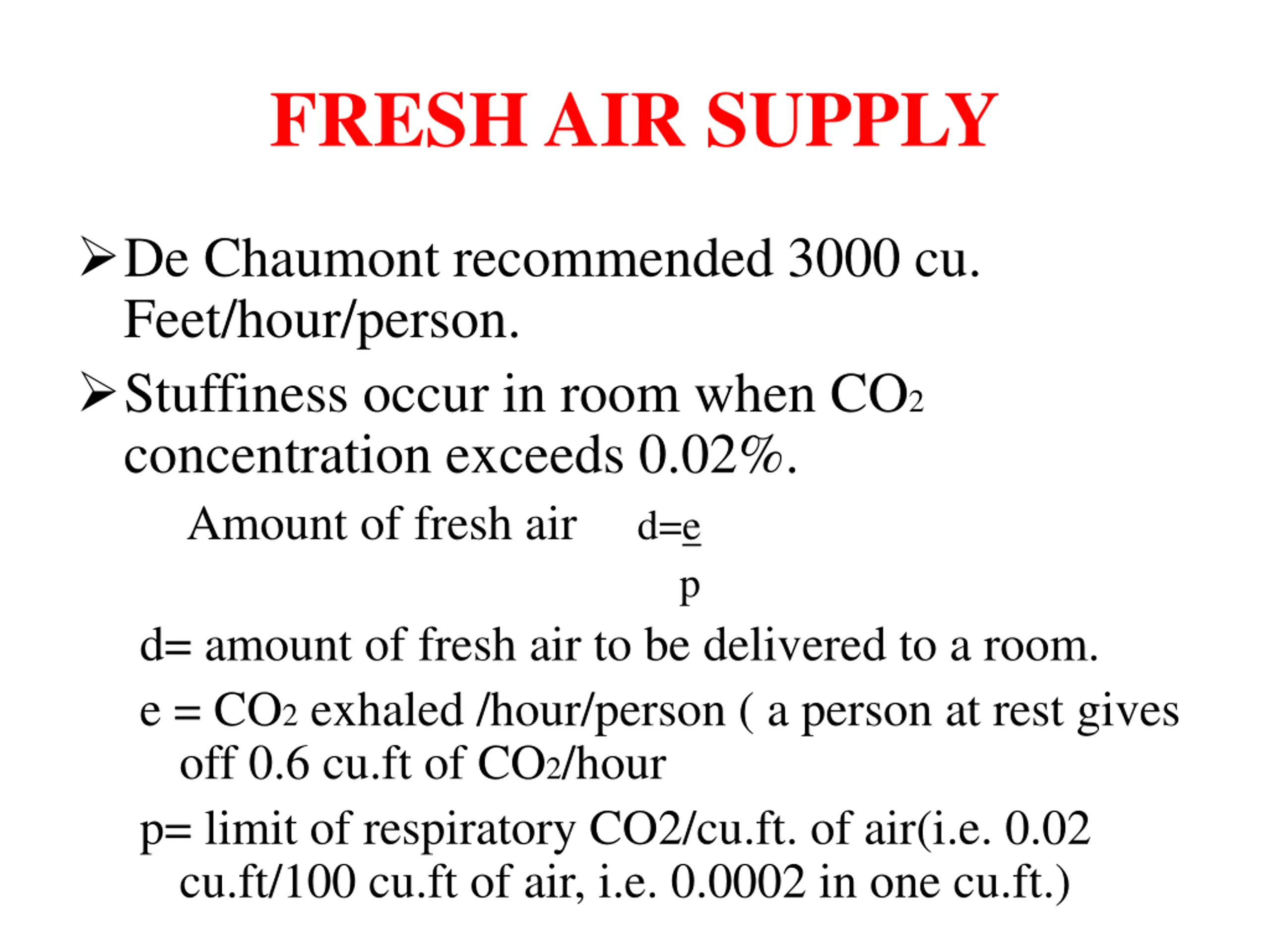 FRESH AIR SUPPLY De Chaumont recommended 3000 cu. Feet/hour/person. Stuffiness occur in room when CO2 concentration exceeds 0.02%. Amount of fresh air d=e p d= amount of fresh air to be delivered to a room. e = CO2 exhaled /hour/person ( a person at rest gives off 0.6 cu.ft of CO2/hour p= limit of respiratory CO2/cu.ft. of air(i.e. 0.02 cu.ft/100 cu.ft of air, i.e. 0.0002 in one cu.ft.)