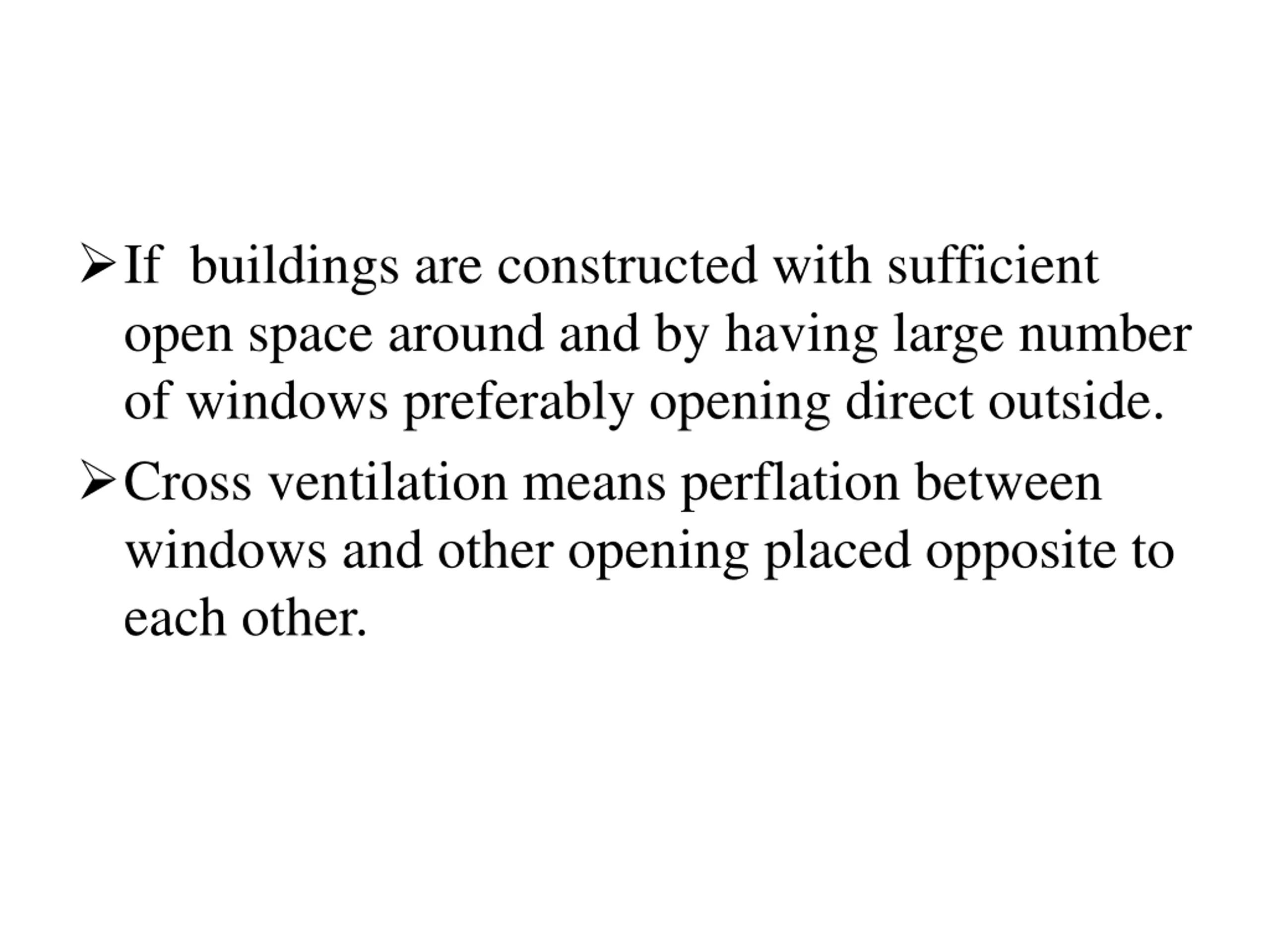 If buildings are constructed with sufficient open space around and by having large number of windows preferably opening direct outside. Cross ventilation means perflation between windows and other opening placed opposite to each other.