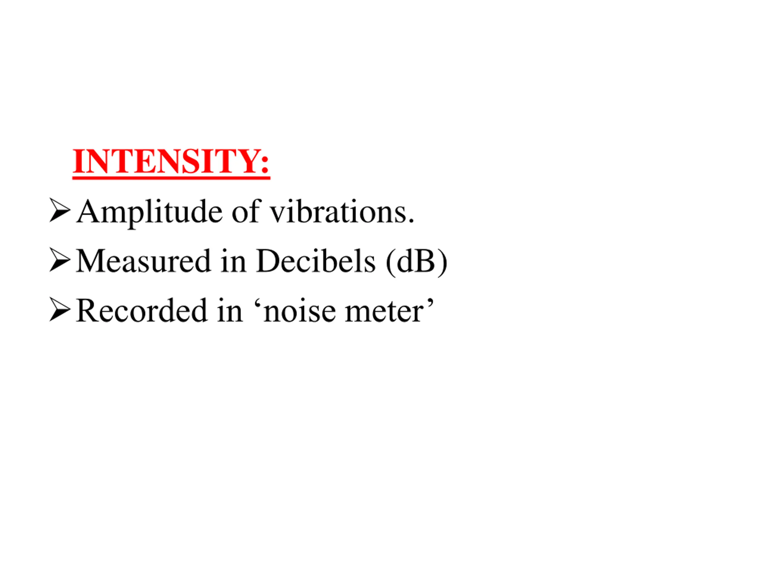 INTENSITY: Amplitude of vibrations. Measured in Decibels (dB) Recorded in noise meter
