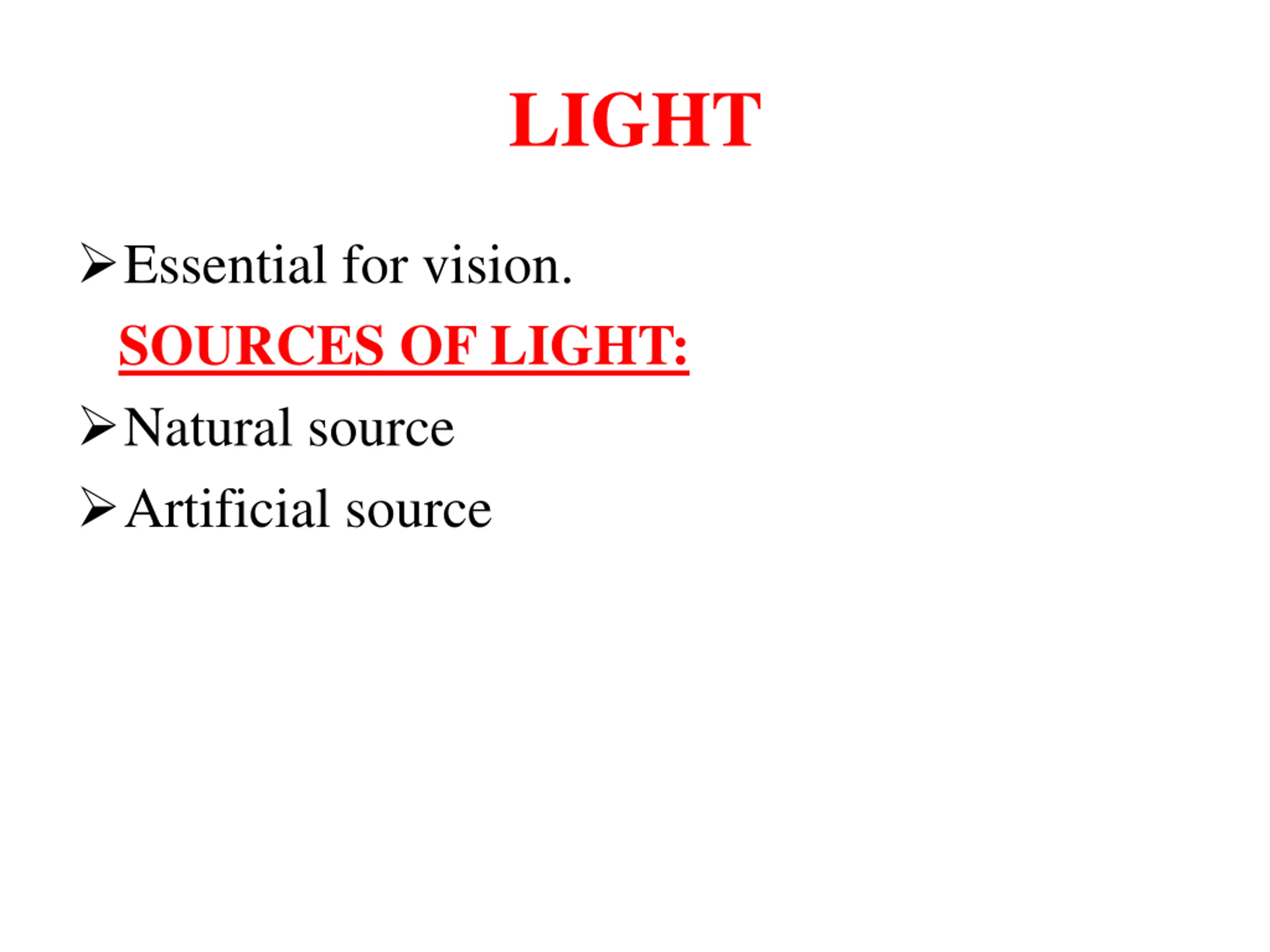 LIGHT Essential for vision. SOURCES OF LIGHT: Natural source Artificial source