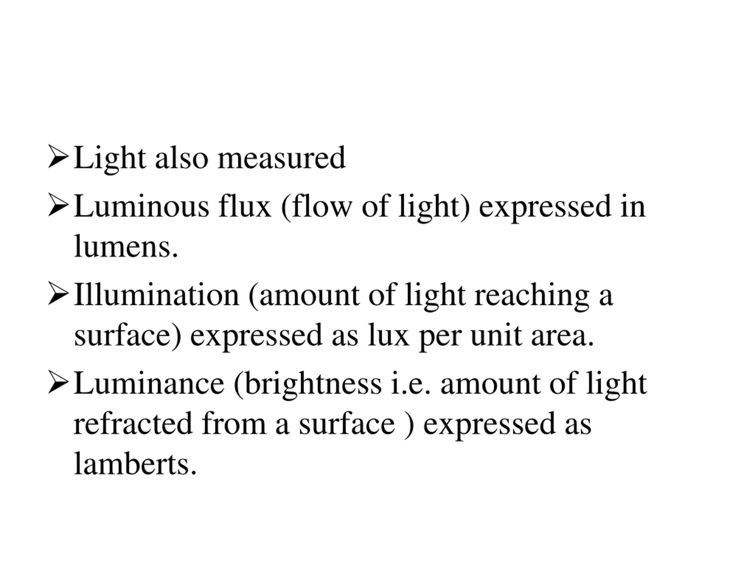 Light also measured Luminous flux (flow of light) expressed in lumens. Illumination (amount of light reaching a surface) expressed as lux per unit area. Luminance (brightness i.e. amount of light refracted from a surface ) expressed as lamberts.