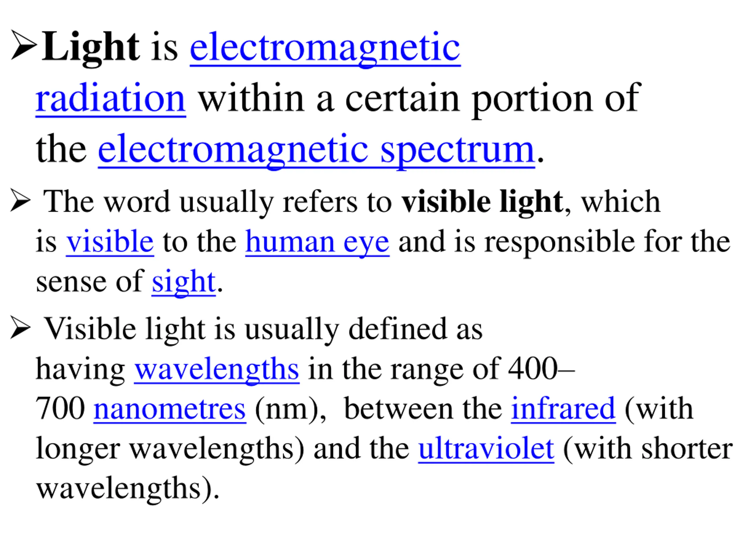 Light is electromagnetic radiation within a certain portion of the electromagnetic spectrum. The word usually refers to visible light, which is visible to the human eye and is responsible for the sense of sight. Visible light is usually defined as having wavelengths in the range of 400 700 nanometres (nm), between the infrared (with longer wavelengths) and the ultraviolet (with shorter wavelengths).