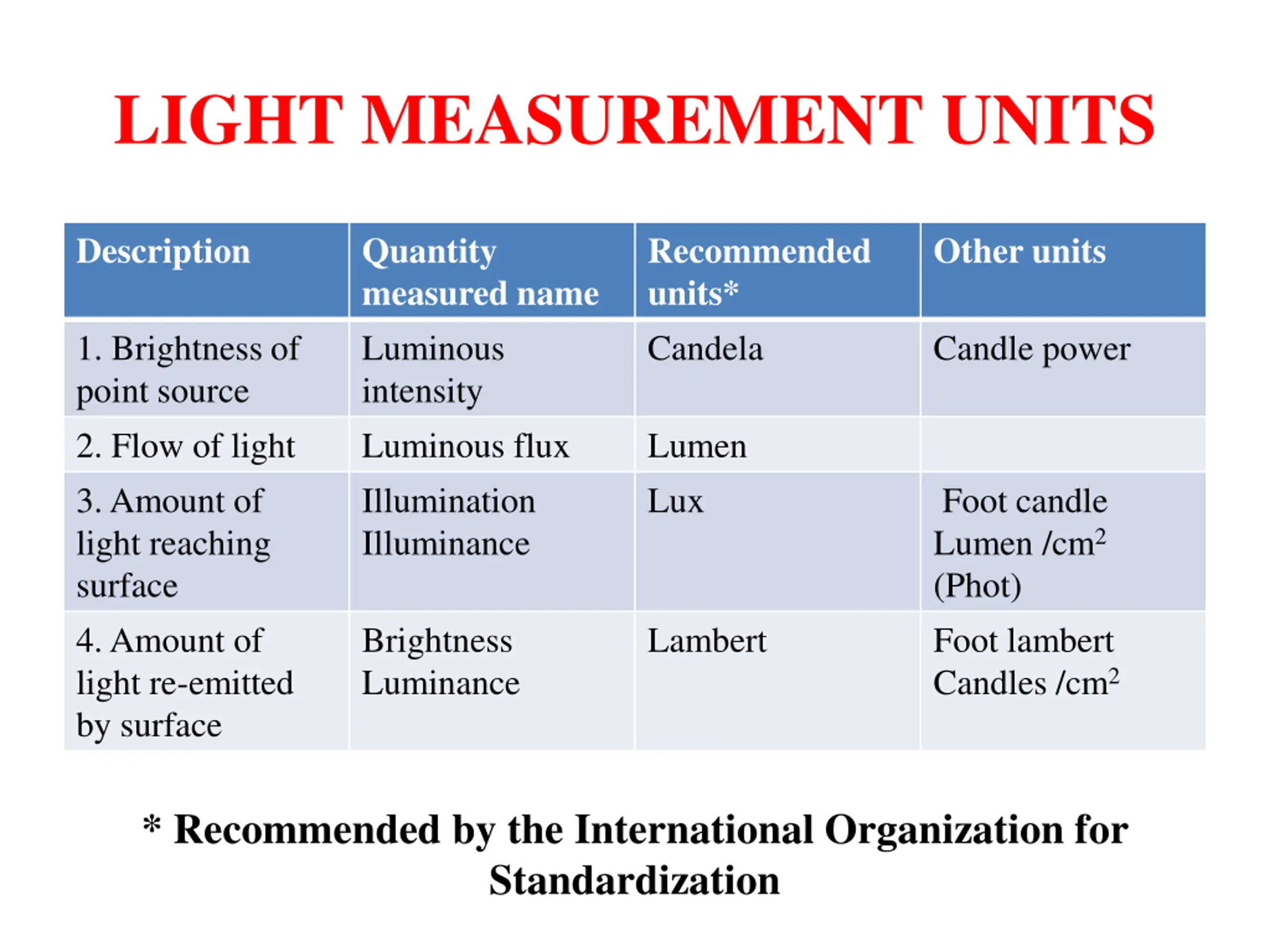 LIGHT MEASUREMENT UNITS Description Quantity measured name Luminous intensity Luminous flux Illumination Illuminance Recommended units* Candela Other units 1. Brightness of point source 2. Flow of light 3. Amount of light reaching surface 4. Amount of light re-emitted by surface Candle power Lumen Lux Foot candle Lumen /cm2 (Phot) Foot lambert Candles /cm2 Brightness Luminance Lambert * Recommended by the International Organization for Standardization