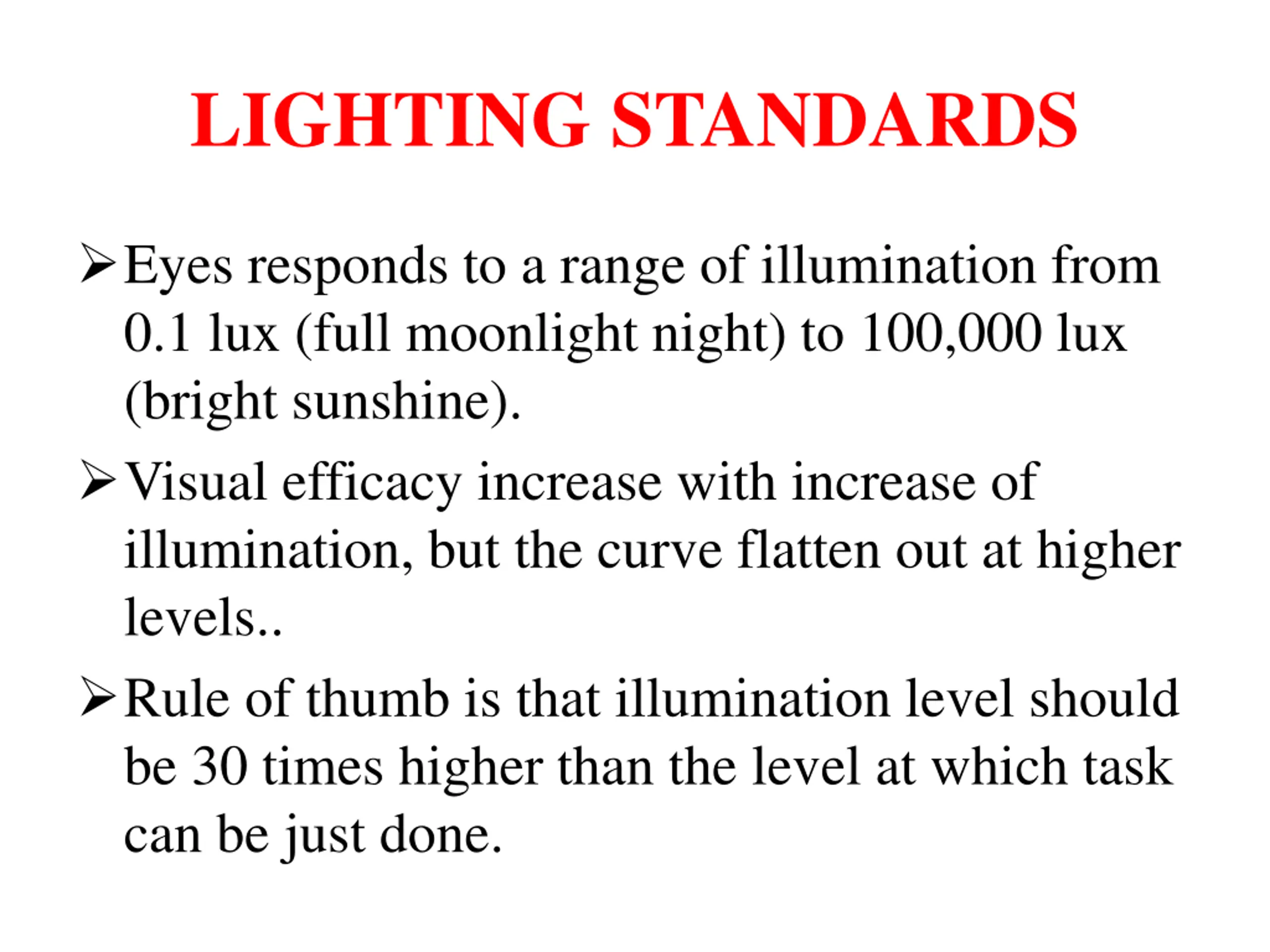 LIGHTING STANDARDS Eyes responds to a range of illumination from 0.1 lux (full moonlight night) to 100,000 lux (bright sunshine). Visual efficacy increase with increase of illumination, but the curve flatten out at higher levels.. Rule of thumb is that illumination level should be 30 times higher than the level at which task can be just done.