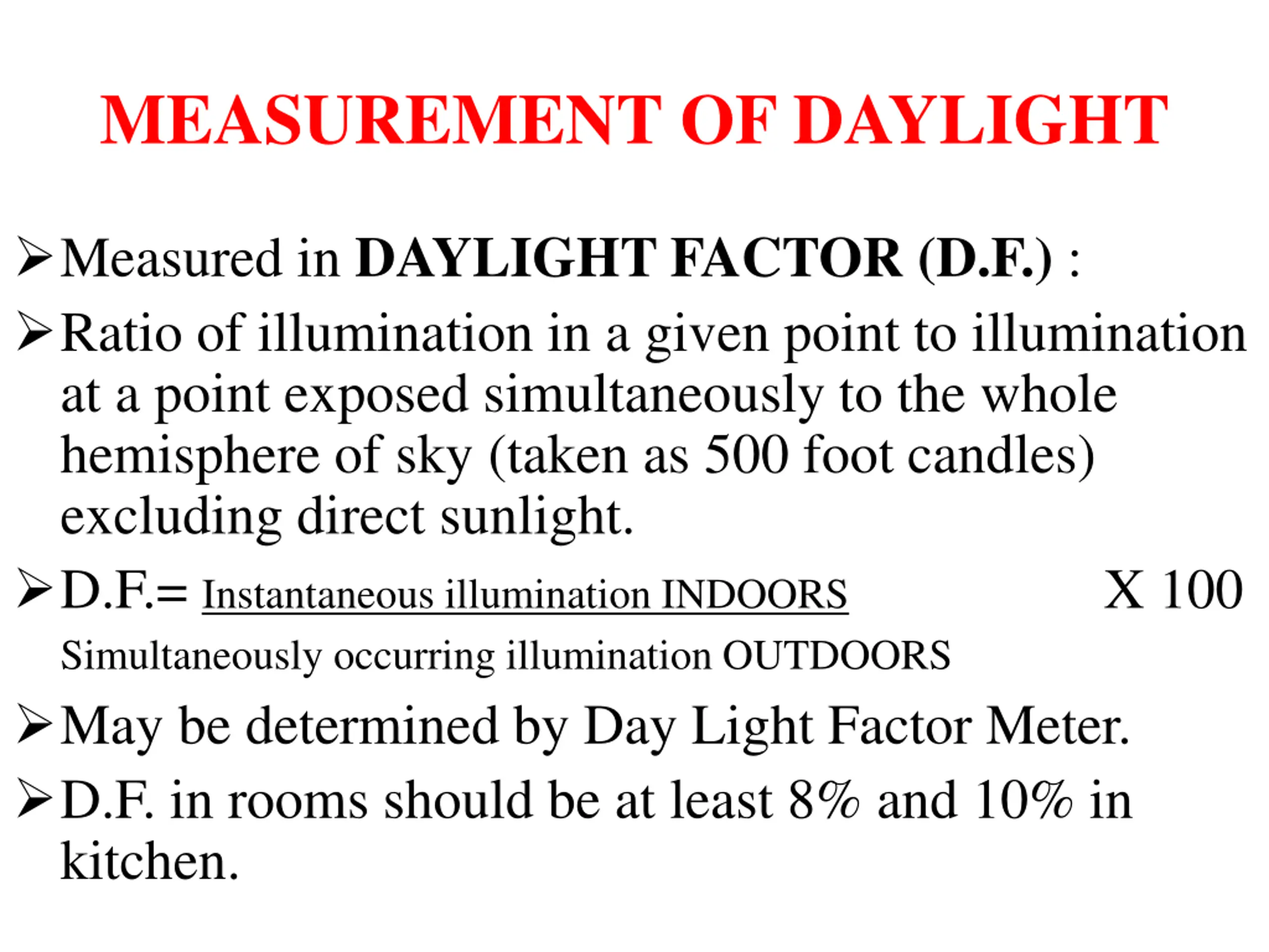 MEASUREMENT OF DAYLIGHT Measured in DAYLIGHT FACTOR (D.F.) : Ratio of illumination in a given point to illumination at a point exposed simultaneously to the whole hemisphere of sky (taken as 500 foot candles) excluding direct sunlight. D.F.= Instantaneous illumination INDOORS X 100 Simultaneously occurring illumination OUTDOORS May be determined by Day Light Factor Meter. D.F. in rooms should be at least 8% and 10% in kitchen.
