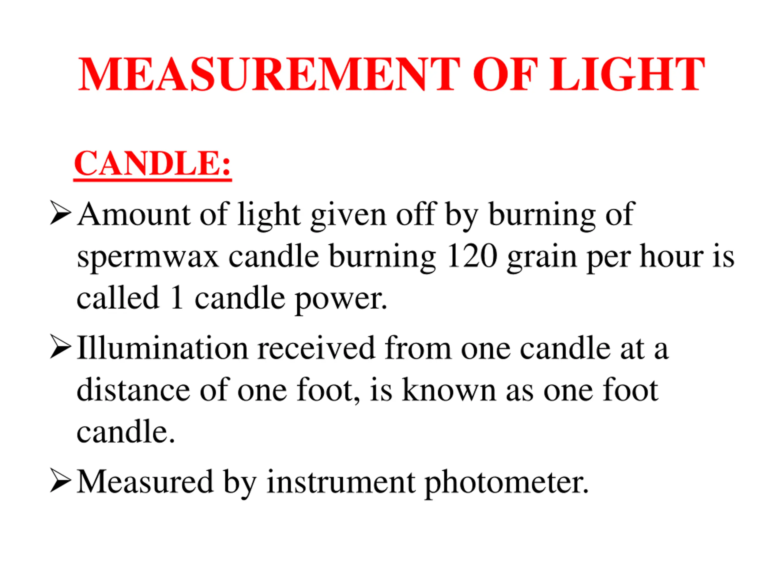 MEASUREMENT OF LIGHT CANDLE: Amount of light given off by burning of spermwax candle burning 120 grain per hour is called 1 candle power. Illumination received from one candle at a distance of one foot, is known as one foot candle. Measured by instrument photometer.