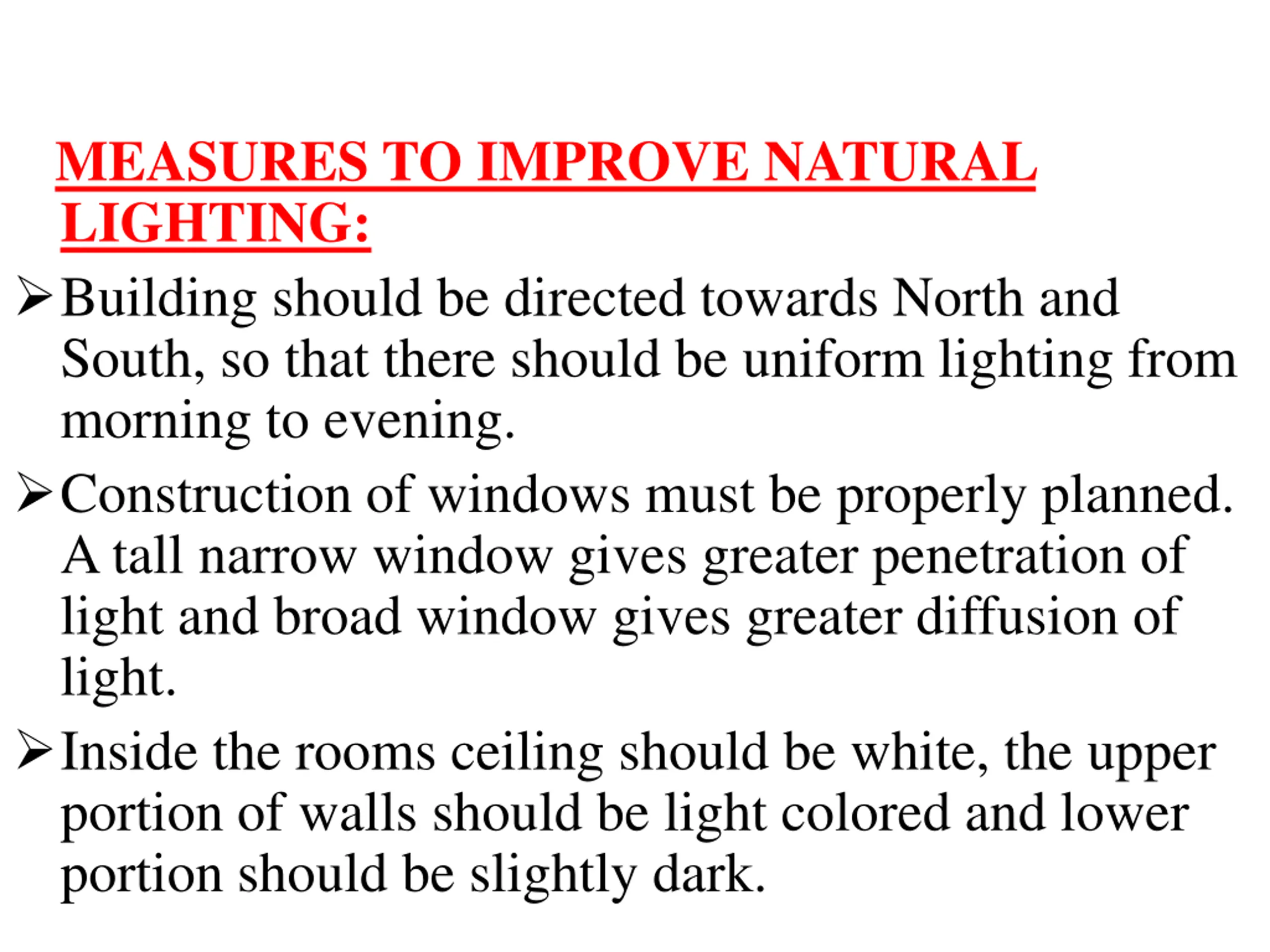 MEASURES TO IMPROVE NATURAL LIGHTING: Building should be directed towards North and South, so that there should be uniform lighting from morning to evening. Construction of windows must be properly planned. A tall narrow window gives greater penetration of light and broad window gives greater diffusion of light. Inside the rooms ceiling should be white, the upper portion of walls should be light colored and lower portion should be slightly dark.