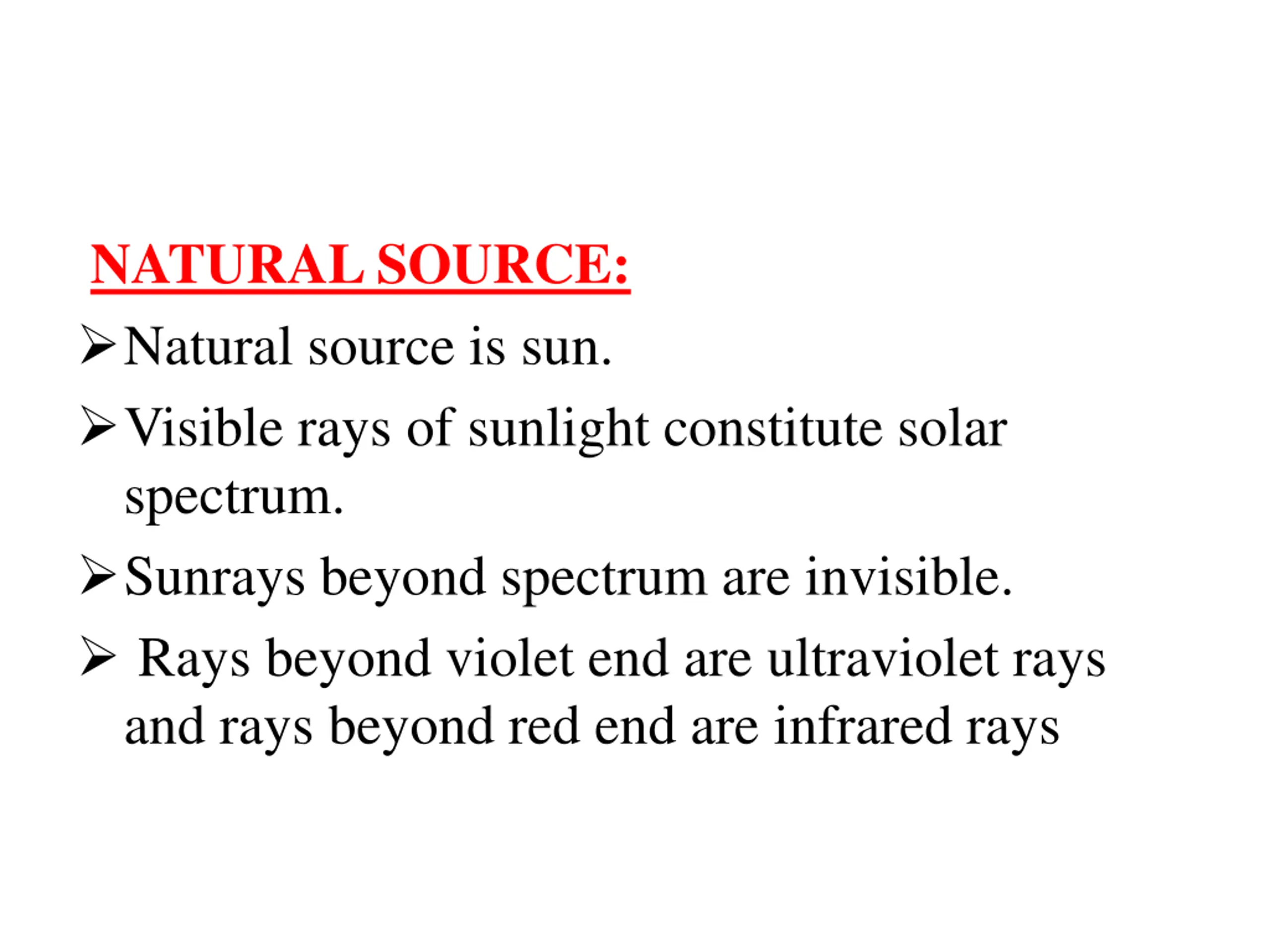 NATURAL SOURCE: Natural source is sun. Visible rays of sunlight constitute solar spectrum. Sunrays beyond spectrum are invisible. Rays beyond violet end are ultraviolet rays and rays beyond red end are infrared rays