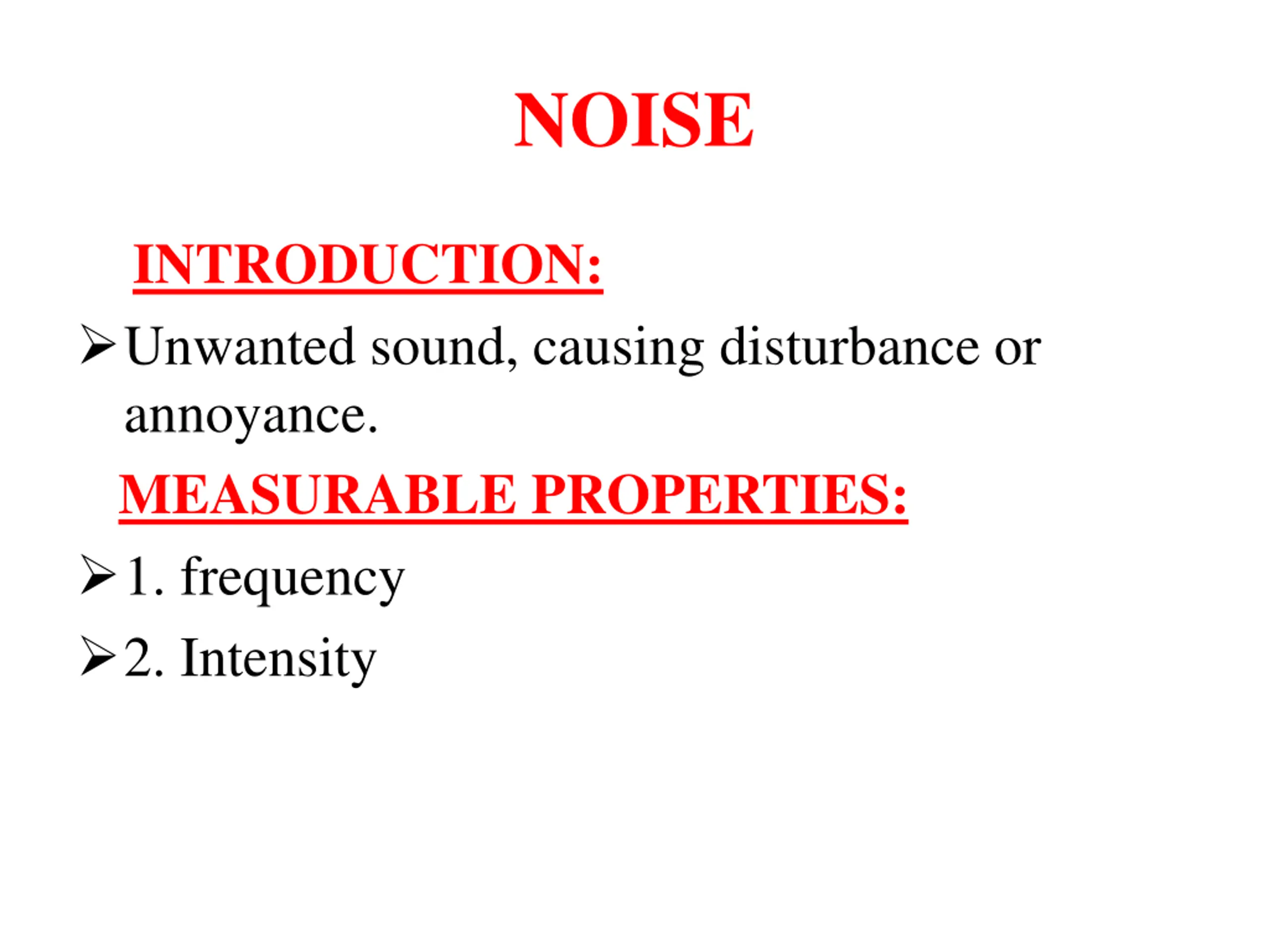 NOISE INTRODUCTION: Unwanted sound, causing disturbance or annoyance. MEASURABLE PROPERTIES: 1. frequency 2. Intensity