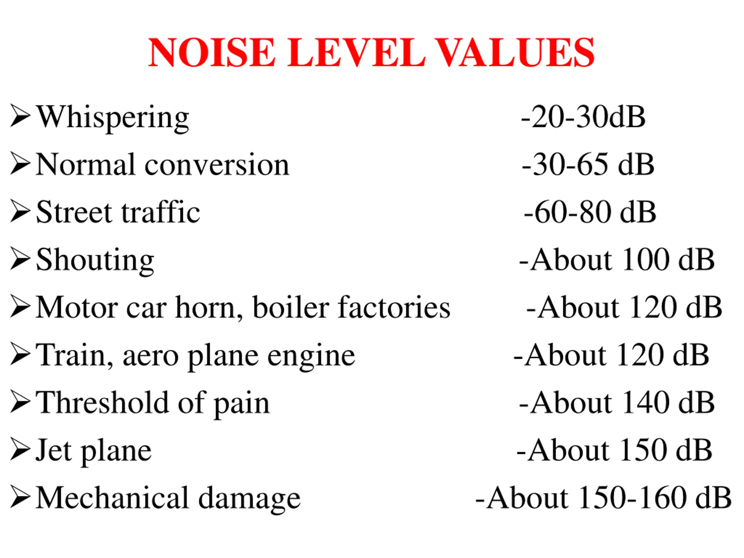 NOISE LEVEL VALUES Whispering -20-30dB Normal conversion -30-65 dB Street traffic -60-80 dB Shouting -About 100 dB Motor car horn, boiler factories -About 120 dB Train, aero plane engine -About 120 dB Threshold of pain -About 140 dB Jet plane -About 150 dB Mechanical damage -About 150-160 dB