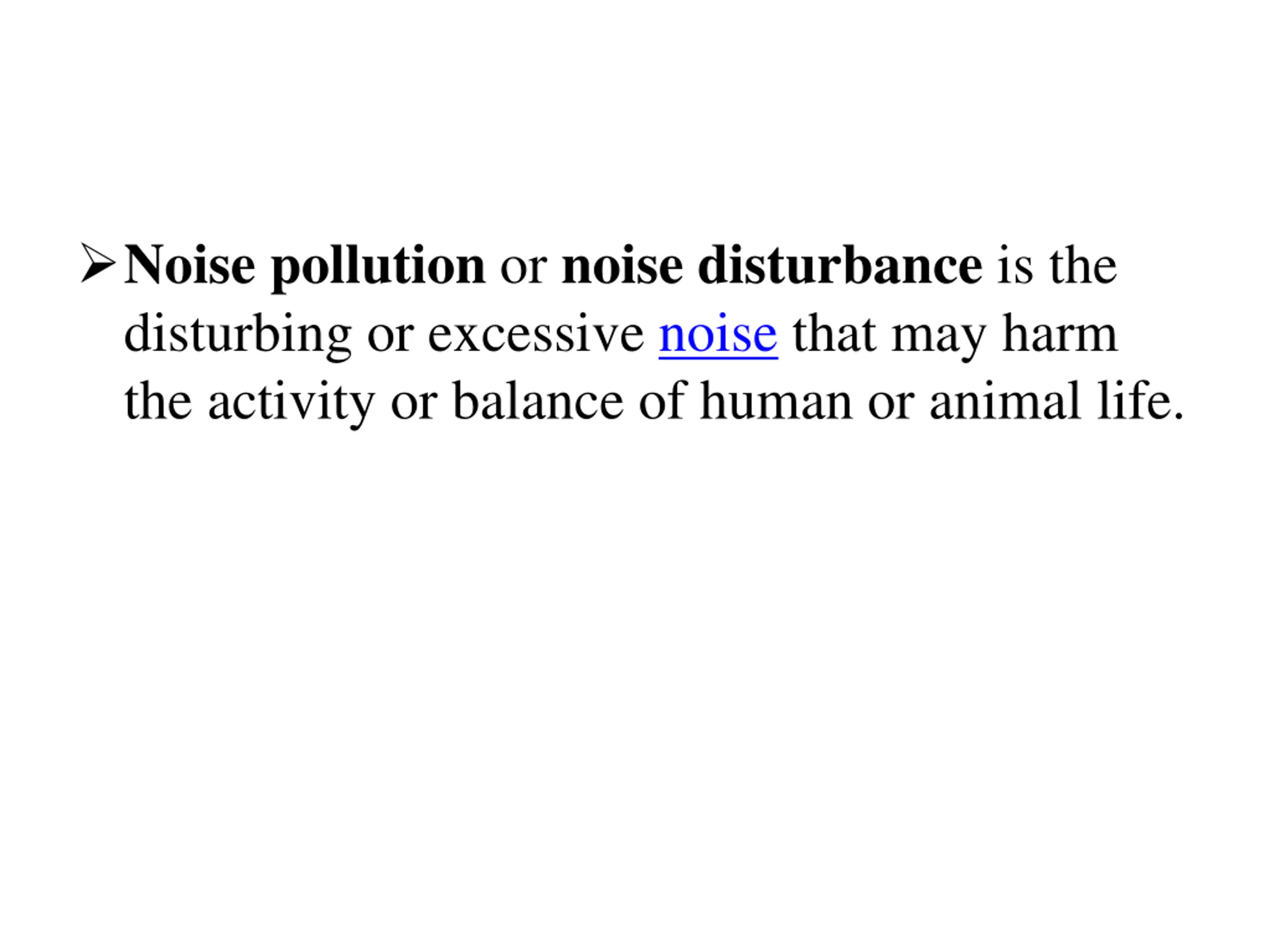Noise pollution or noise disturbance is the disturbing or excessive noise that may harm the activity or balance of human or animal life.