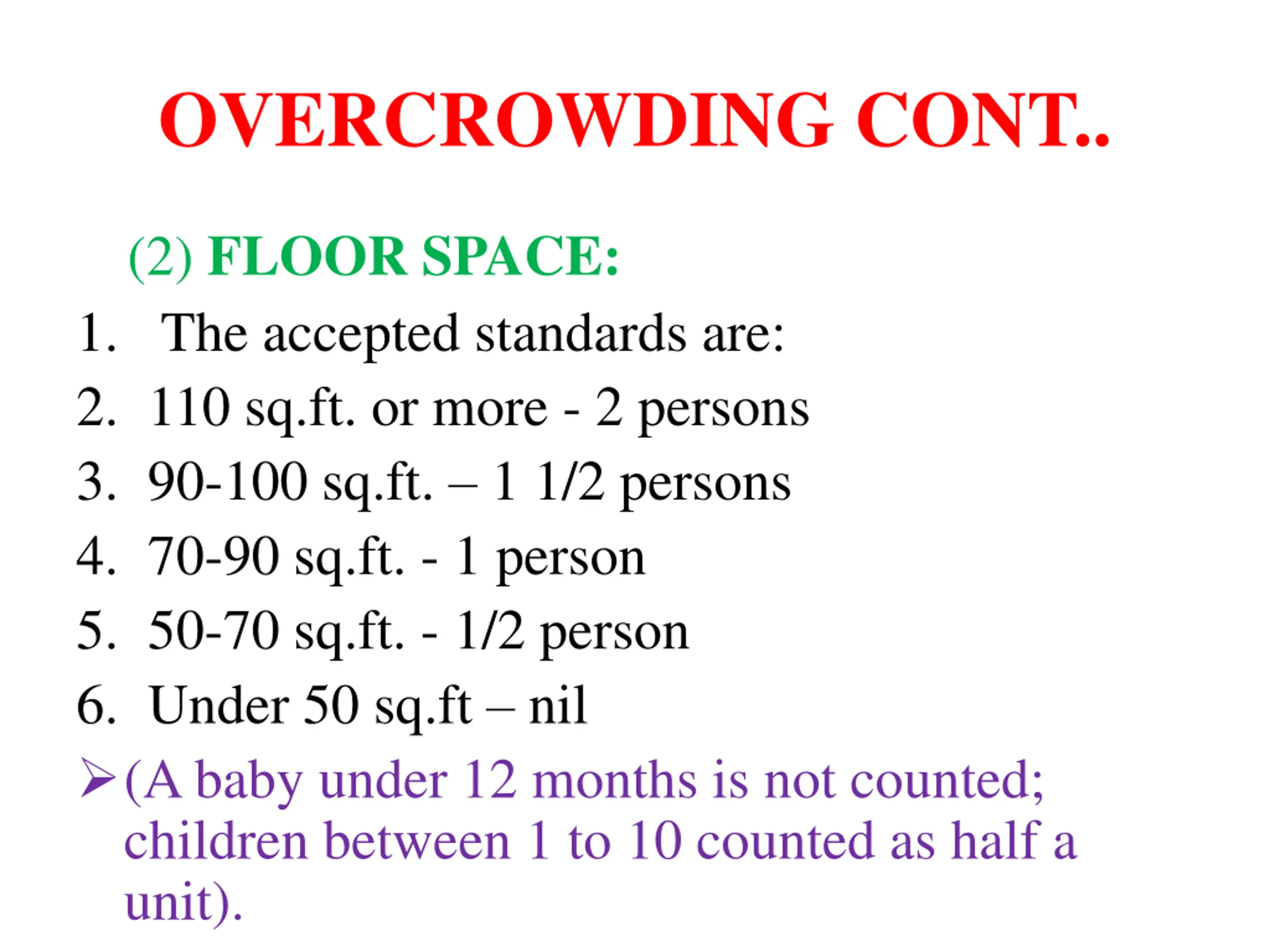 OVERCROWDING CONT.. (2) FLOOR SPACE: 1. The accepted standards are: 2. 110 sq.ft. or more - 2 persons 3. 90-100 sq.ft. 1 1/2 persons 4. 70-90 sq.ft. - 1 person 5. 50-70 sq.ft. - 1/2 person 6. Under 50 sq.ft nil (A baby under 12 months is not counted; children between 1 to 10 counted as half a unit).