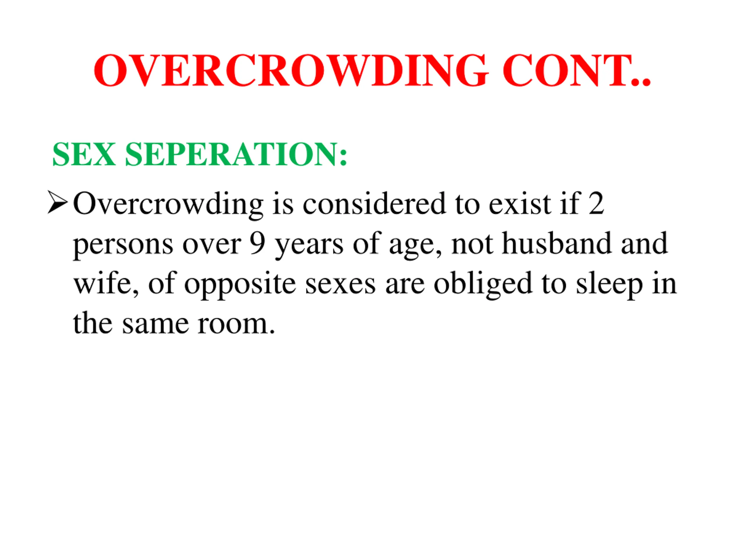 OVERCROWDING CONT.. SEX SEPERATION: Overcrowding is considered to exist if 2 persons over 9 years of age, not husband and wife, of opposite sexes are obliged to sleep in the same room.