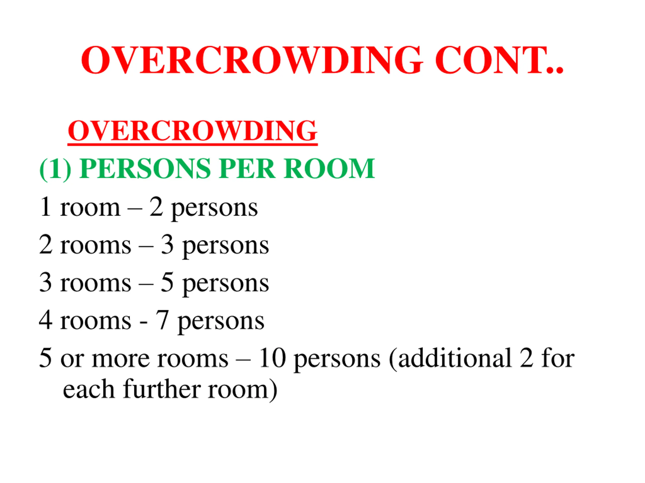 OVERCROWDING CONT.. OVERCROWDING (1) PERSONS PER ROOM 1 room 2 persons 2 rooms 3 persons 3 rooms 5 persons 4 rooms - 7 persons 5 or more rooms 10 persons (additional 2 for each further room)