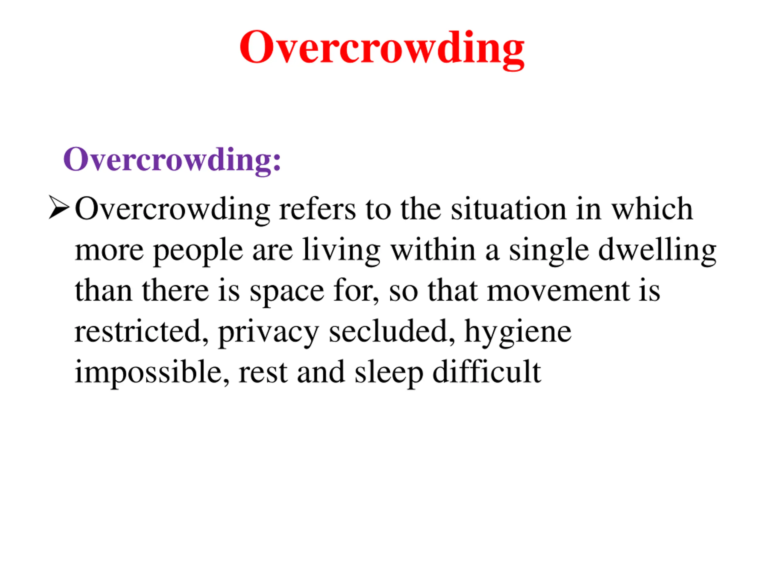 Overcrowding Overcrowding: Overcrowding refers to the situation in which more people are living within a single dwelling than there is space for, so that movement is restricted, privacy secluded, hygiene impossible, rest and sleep difficult