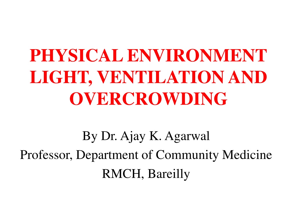 PHYSICAL ENVIRONMENT LIGHT, VENTILATION AND OVERCROWDING By Dr. Ajay K. Agarwal Professor, Department of Community Medicine RMCH, Bareilly