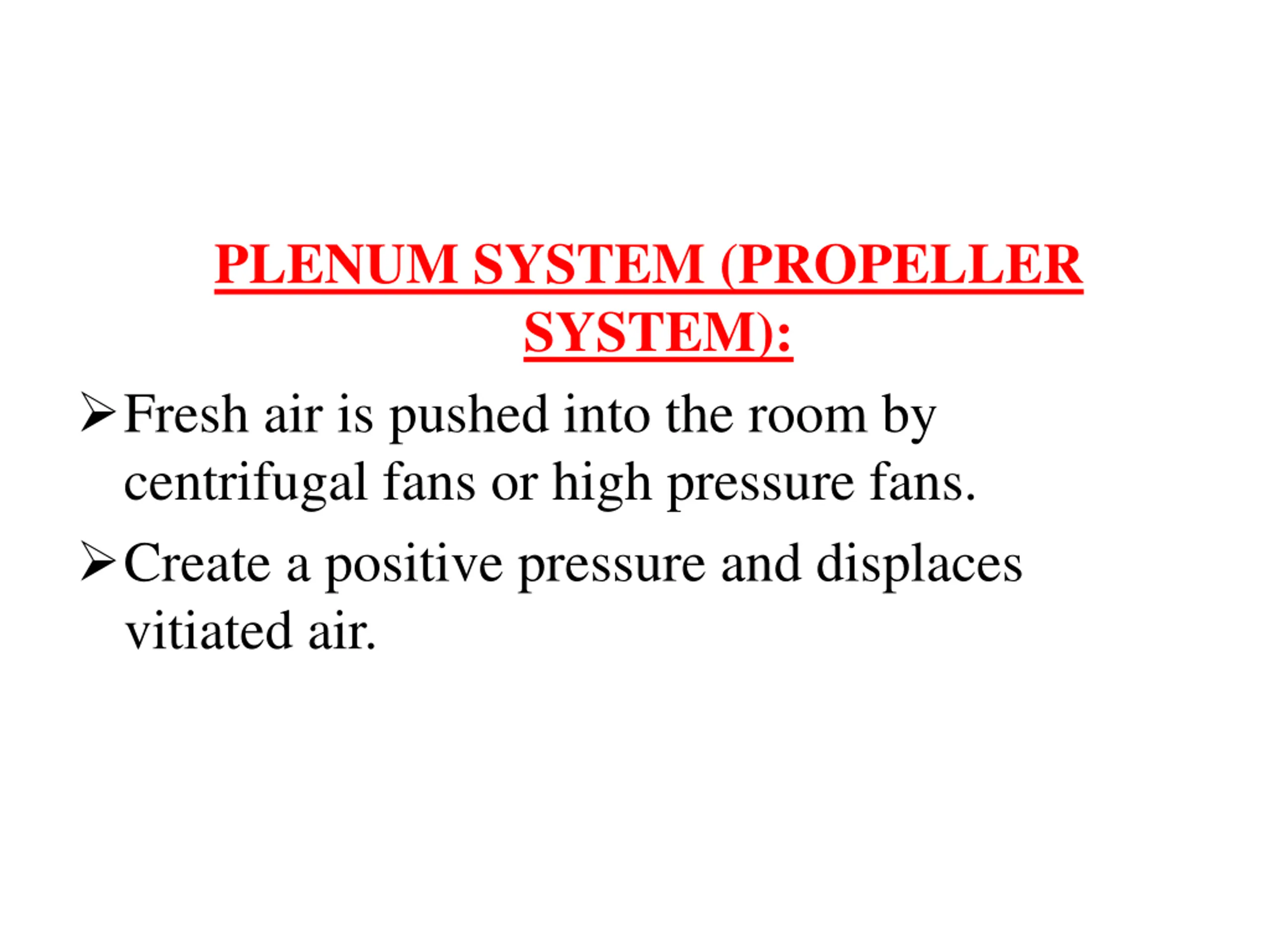 PLENUM SYSTEM (PROPELLER SYSTEM): Fresh air is pushed into the room by centrifugal fans or high pressure fans. Create a positive pressure and displaces vitiated air.