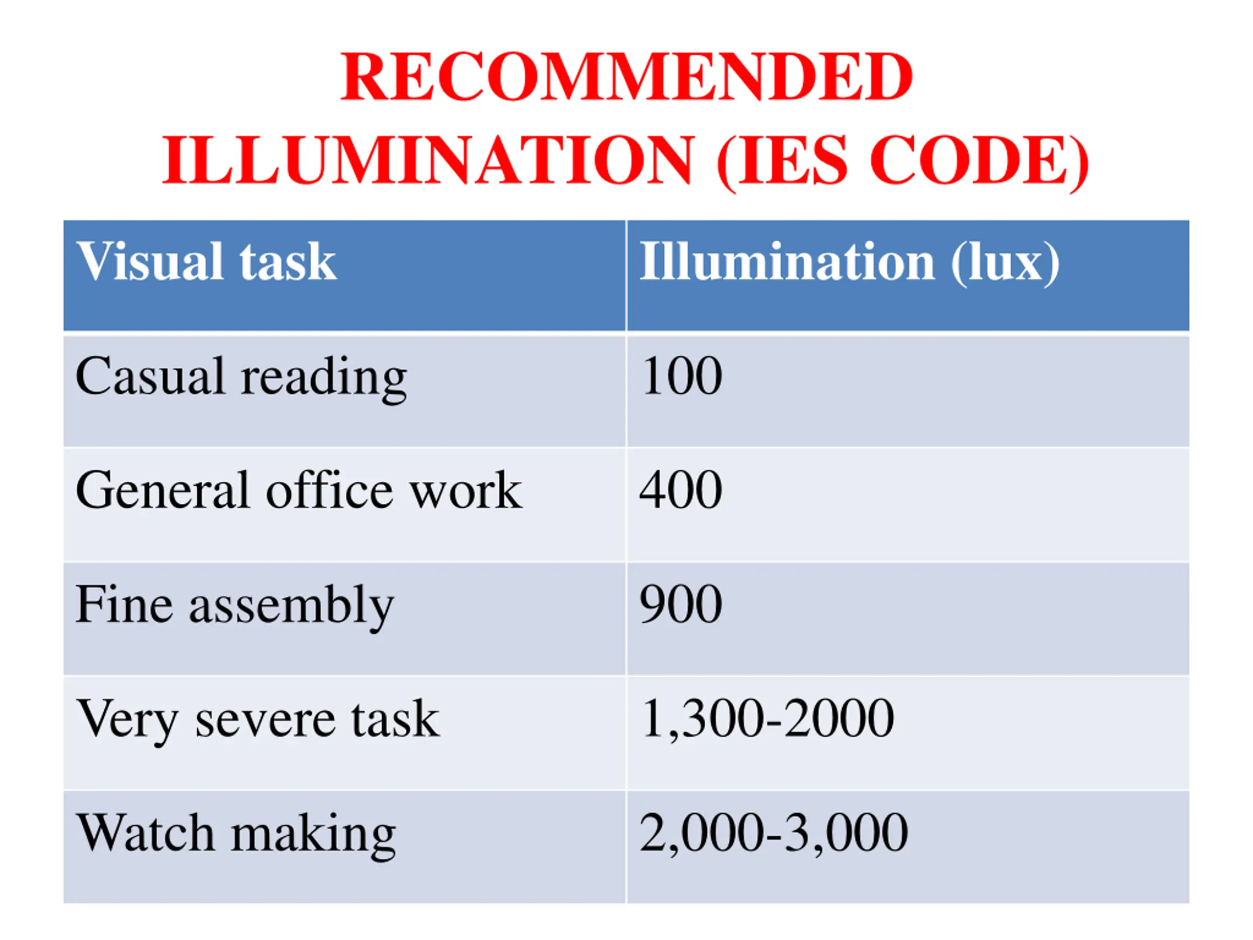 RECOMMENDED ILLUMINATION (IES CODE) Visual task Illumination (lux) Casual reading 100 General office work 400 Fine assembly 900 Very severe task 1,300-2000 Watch making 2,000-3,000
