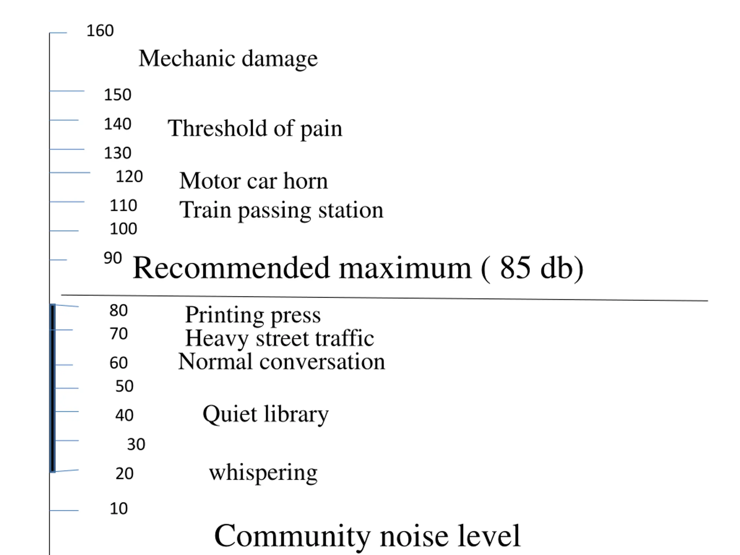 160 Mechanic damage 150 Threshold of pain 140 130 120 Motor car horn Train passing station 110 100 Recommended maximum ( 85 db) 90 Printing press Heavy street traffic Normal conversation 80 70 60 50 Quiet library 40 30 whispering 20 10 Community noise level