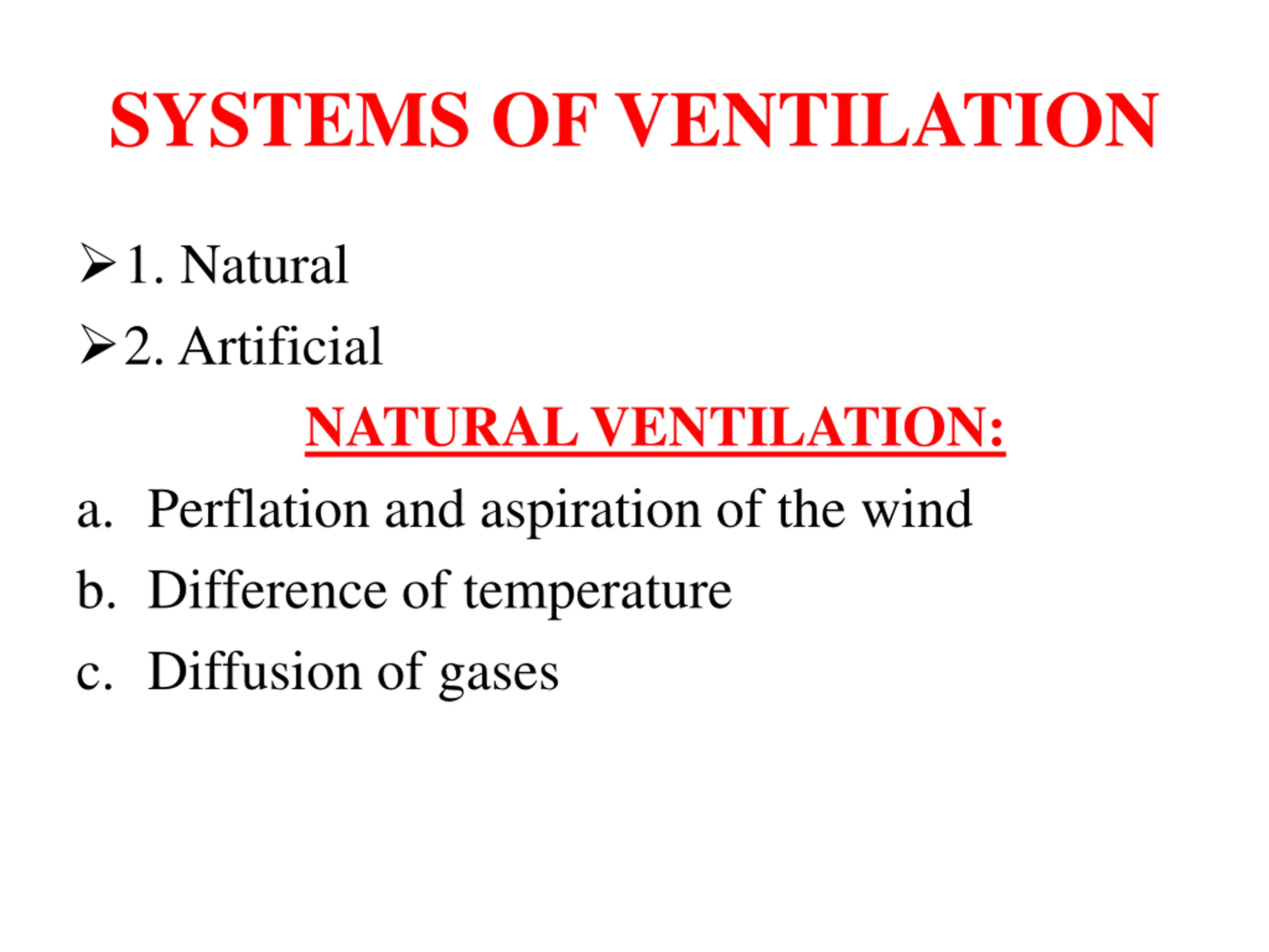 SYSTEMS OF VENTILATION 1. Natural 2. Artificial NATURAL VENTILATION: a. Perflation and aspiration of the wind b. Difference of temperature c. Diffusion of gases
