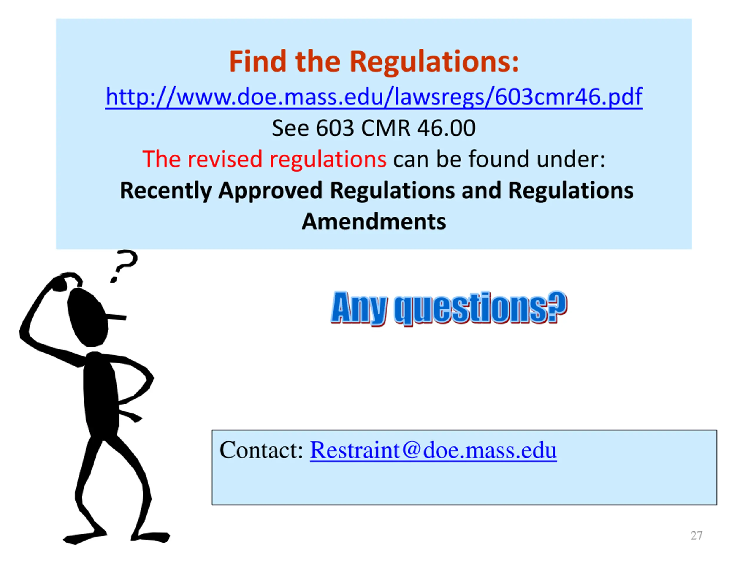Find the Regulations: http://www.doe.mass.edu/lawsregs/603cmr46.pdf See 603 CMR 46.00 The revised regulations can be found under: Recently Approved Regulations and Regulations Amendments Any questions? Contact: Restraint@doe.mass.edu 27