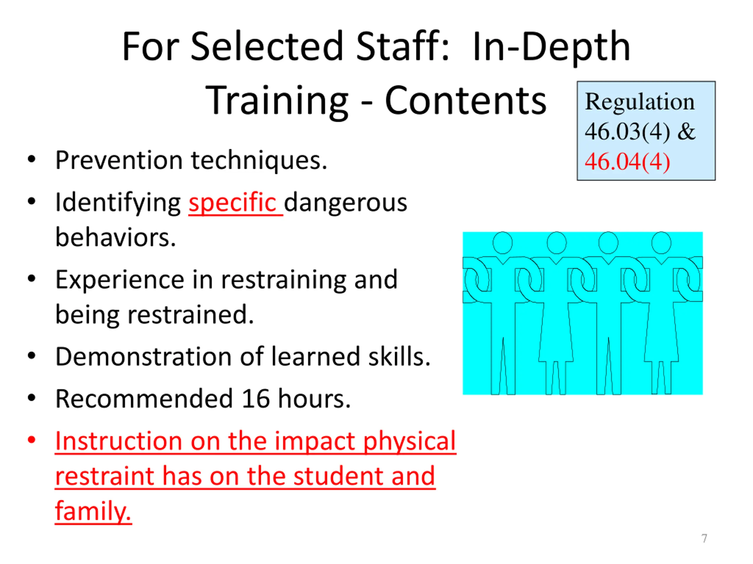 For Selected Staff: In-Depth Training - Contents Regulation 46.03(4) & 46.04(4) Prevention techniques. Identifying specific dangerous behaviors. Experience in restraining and being restrained. Demonstration of learned skills. Recommended 16 hours. Instruction on the impact physical restraint has on the student and family. 7