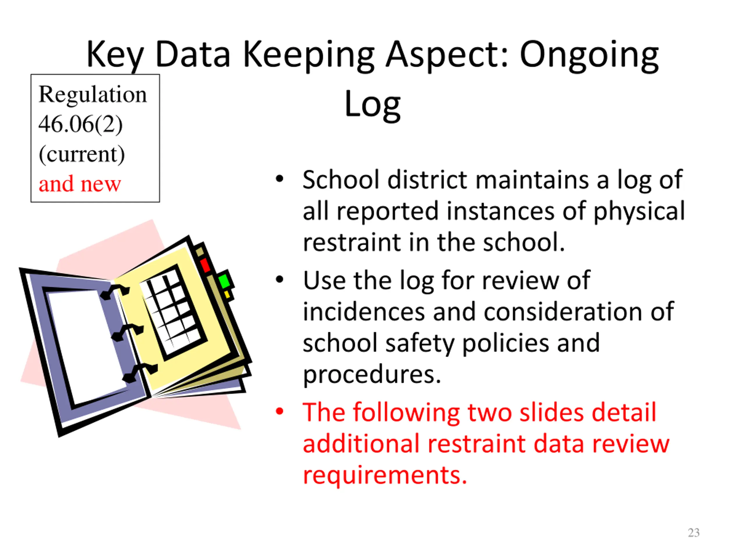 Key Data Keeping Aspect: Ongoing Log 46.06(2) (current) and new Regulation School district maintains a log of all reported instances of physical restraint in the school. Use the log for review of incidences and consideration of school safety policies and procedures. The following two slides detail additional restraint data review requirements. 23