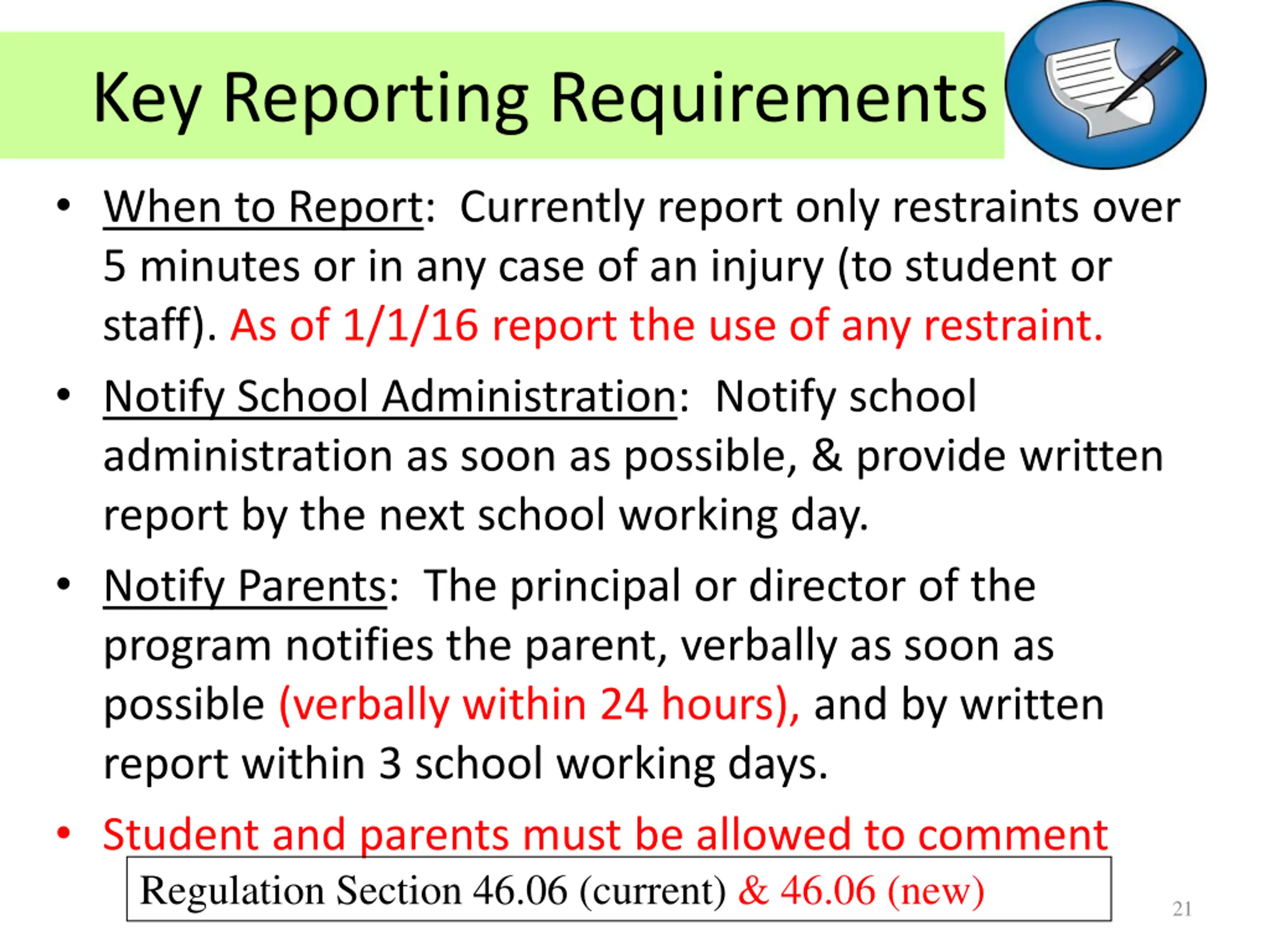 Key Reporting Requirements When to Report: Currently report only restraints over 5 minutes or in any case of an injury (to student or staff). As of 1/1/16 report the use of any restraint. Notify School Administration: Notify school administration as soon as possible, & provide written report by the next school working day. Notify Parents: The principal or director of the program notifies the parent, verbally as soon as possible (verbally within 24 hours), and by written report within 3 school working days. Student and parents must be allowed to comment Regulation Section 46.06 (current) & 46.06 (new) 21