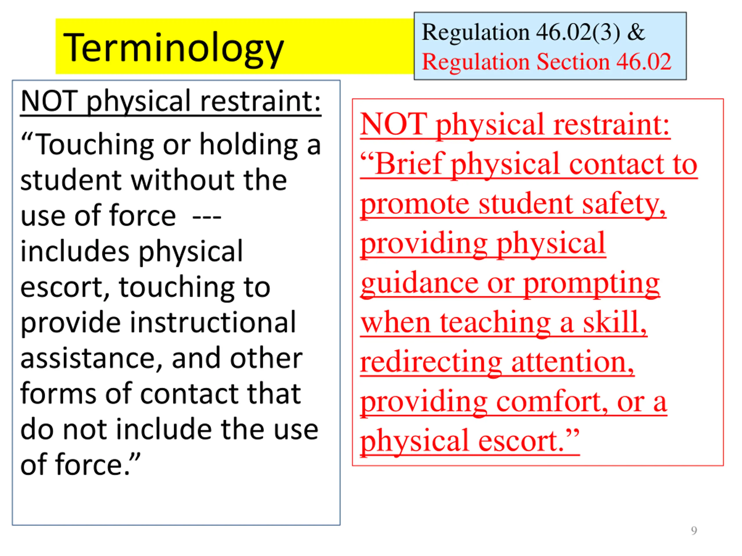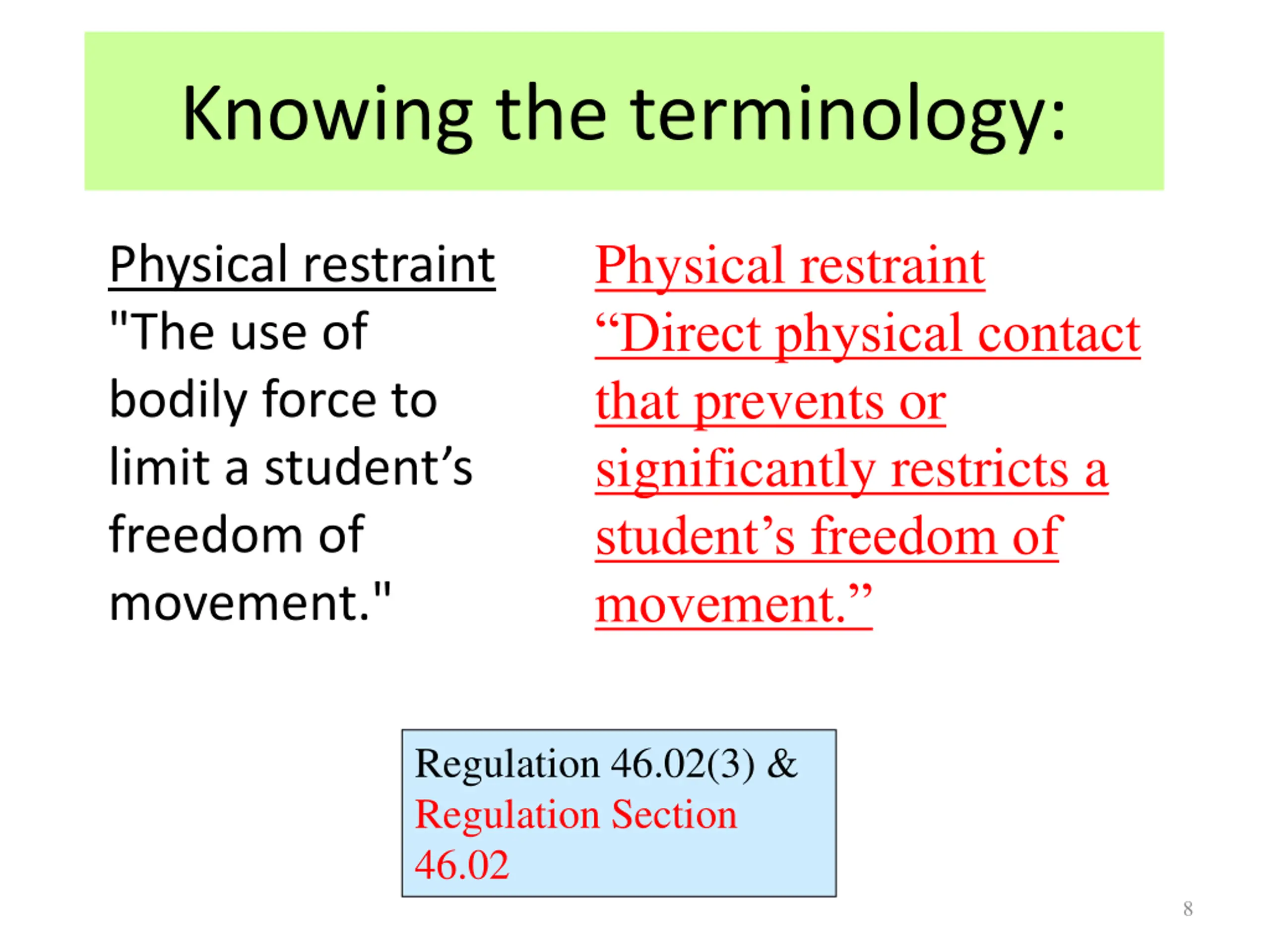 Knowing the terminology: Physical restraint Direct physical contact that prevents or significantly restricts a student s freedom of movement. Physical restraint "The use of bodily force to limit a student s freedom of movement." Regulation 46.02(3) & Regulation Section 46.02 8