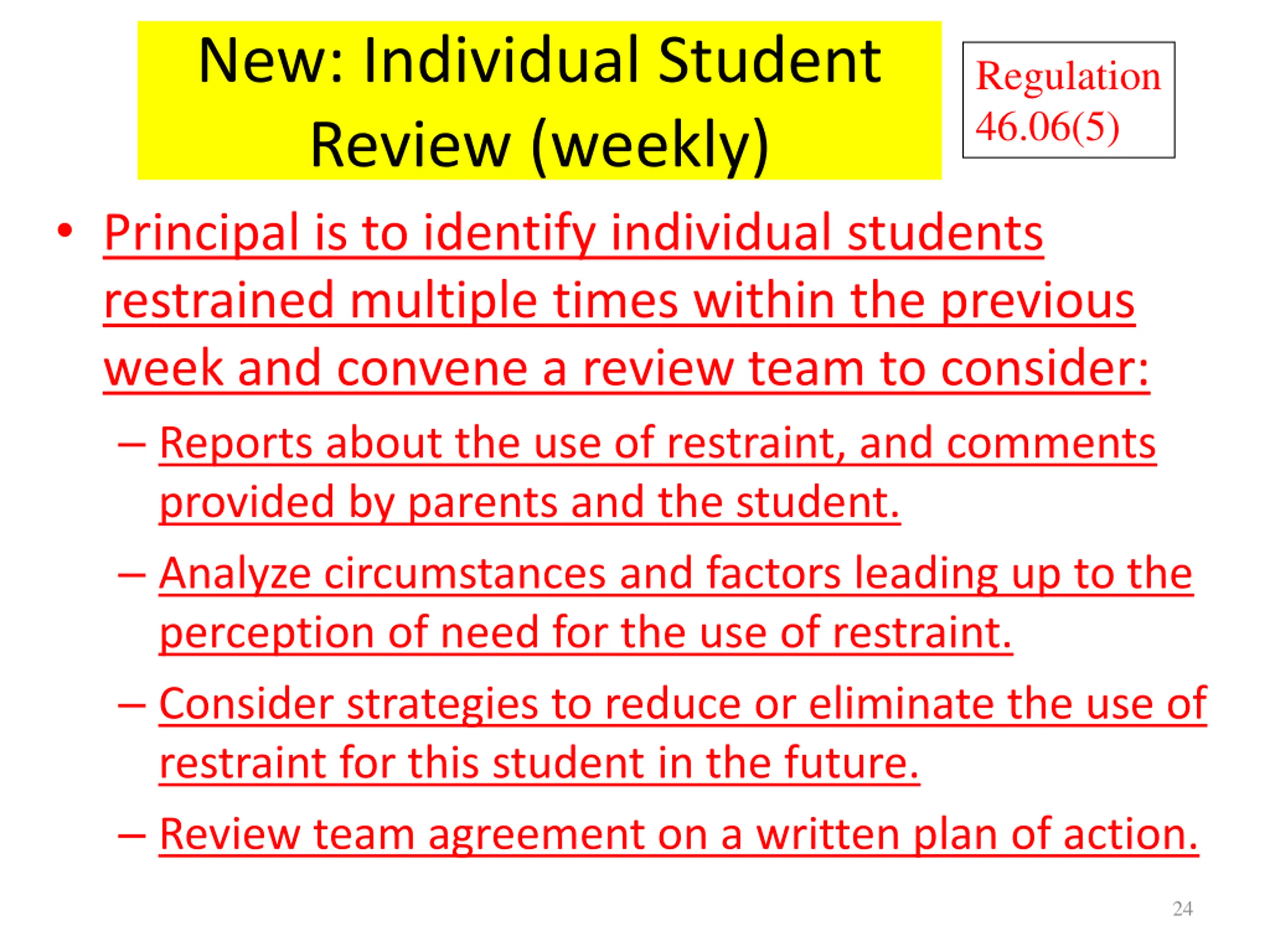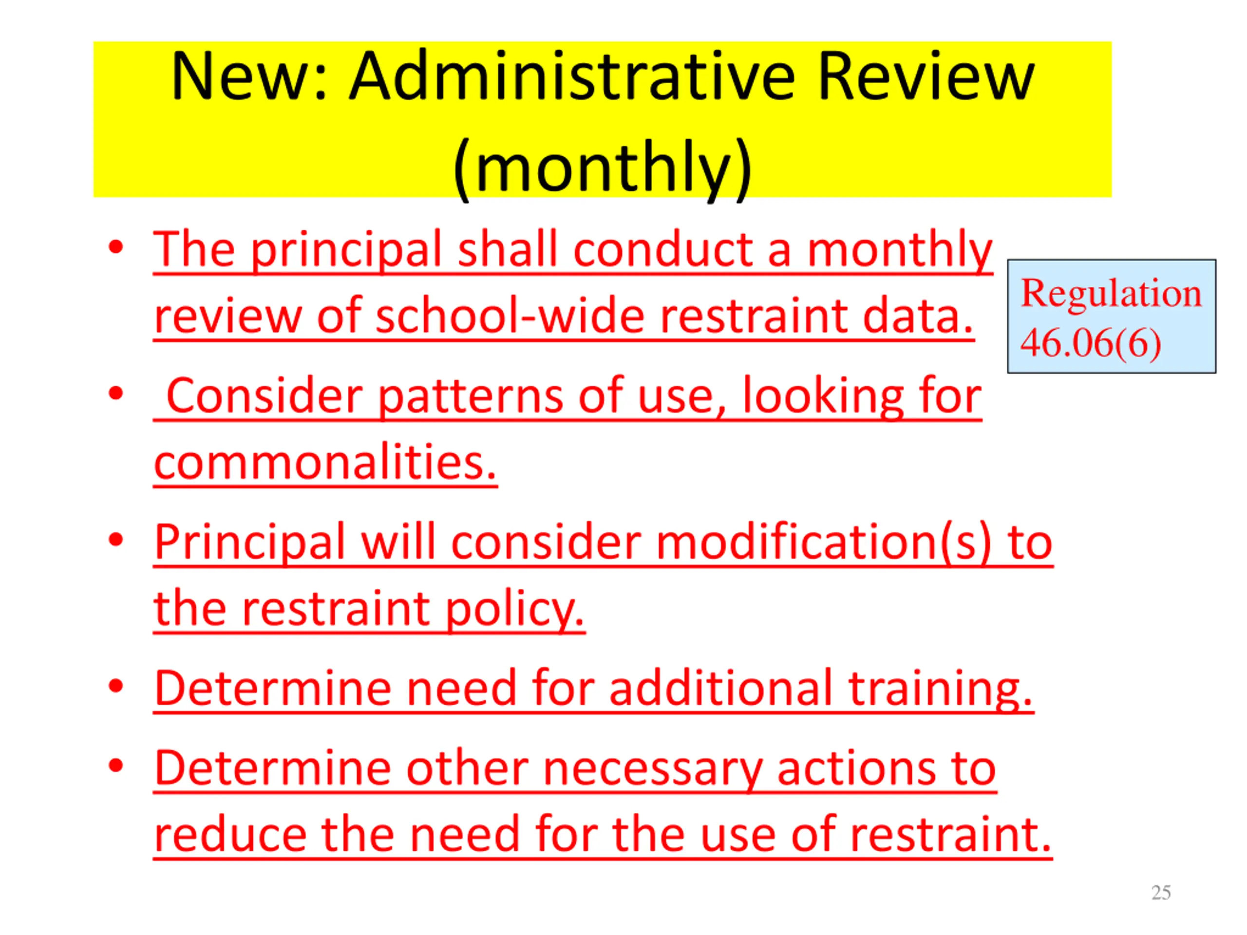 New: Individual Student Review (weekly) Principal is to identify individual students restrained multiple times within the previous week and convene a review team to consider: Reports about the use of restraint, and comments provided by parents and the student. Analyze circumstances and factors leading up to the perception of need for the use of restraint. Consider strategies to reduce or eliminate the use of restraint for this student in the future. Review team agreement on a written plan of action. Regulation 46.06(5) 24