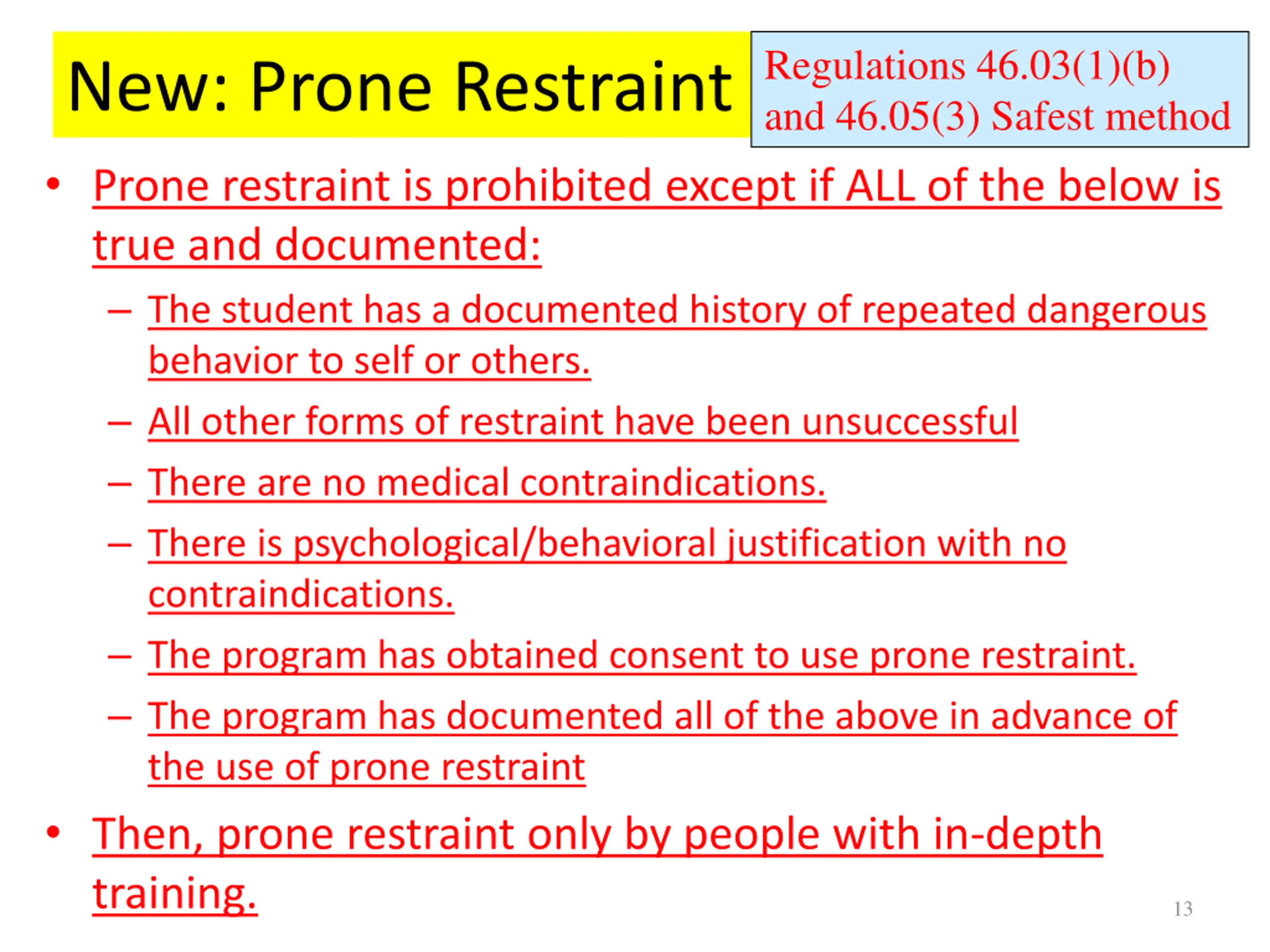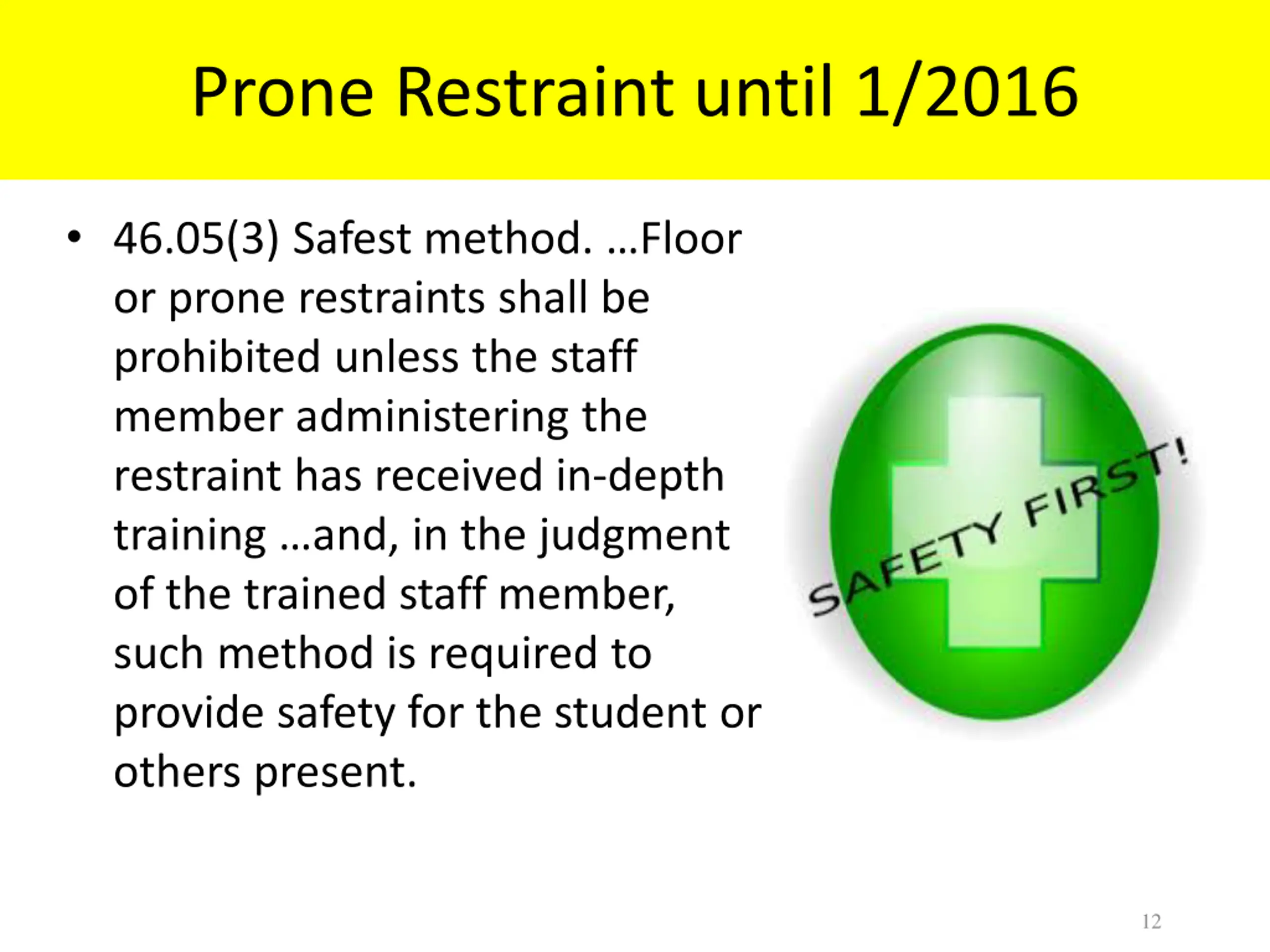 Prone Restraint until 1/2016 46.05(3) Safest method. Floor or prone restraints shall be prohibited unless the staff member administering the restraint has received in-depth training and, in the judgment of the trained staff member, such method is required to provide safety for the student or others present. 12