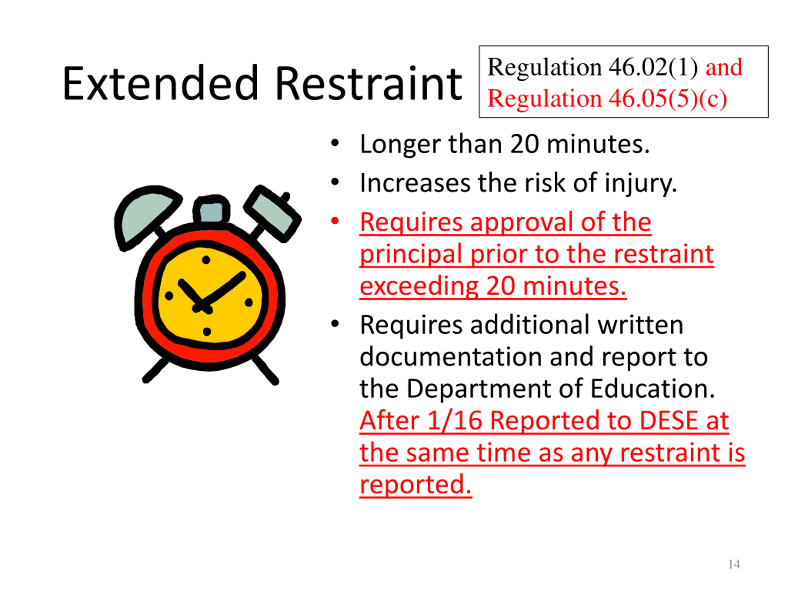 Regulation 46.02(1) and Regulation 46.05(5)(c) Extended Restraint Longer than 20 minutes. Increases the risk of injury. Requires approval of the principal prior to the restraint exceeding 20 minutes. Requires additional written documentation and report to the Department of Education. After 1/16 Reported to DESE at the same time as any restraint is reported. 14