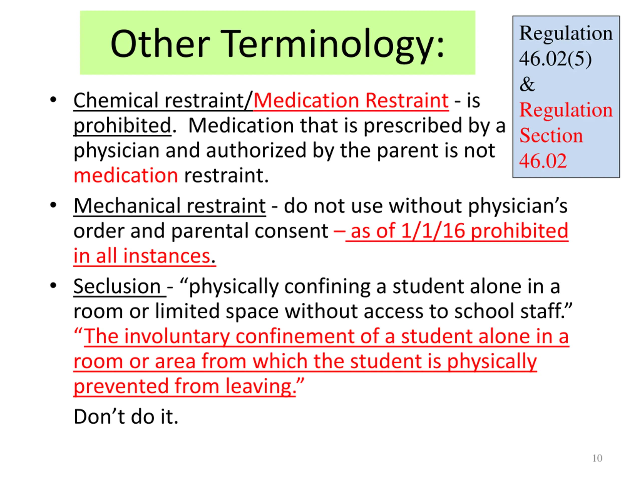 Regulation 46.02(5) & Regulation Section 46.02 Other Terminology: Chemical restraint/Medication Restraint - is prohibited. Medication that is prescribed by a physician and authorized by the parent is not medication restraint. Mechanical restraint - do not use without physician s order and parental consent as of 1/1/16 prohibited in all instances. Seclusion - physically confining a student alone in a room or limited space without access to school staff. The involuntary confinement of a student alone in a room or area from which the student is physically prevented from leaving. Don t do it. 10