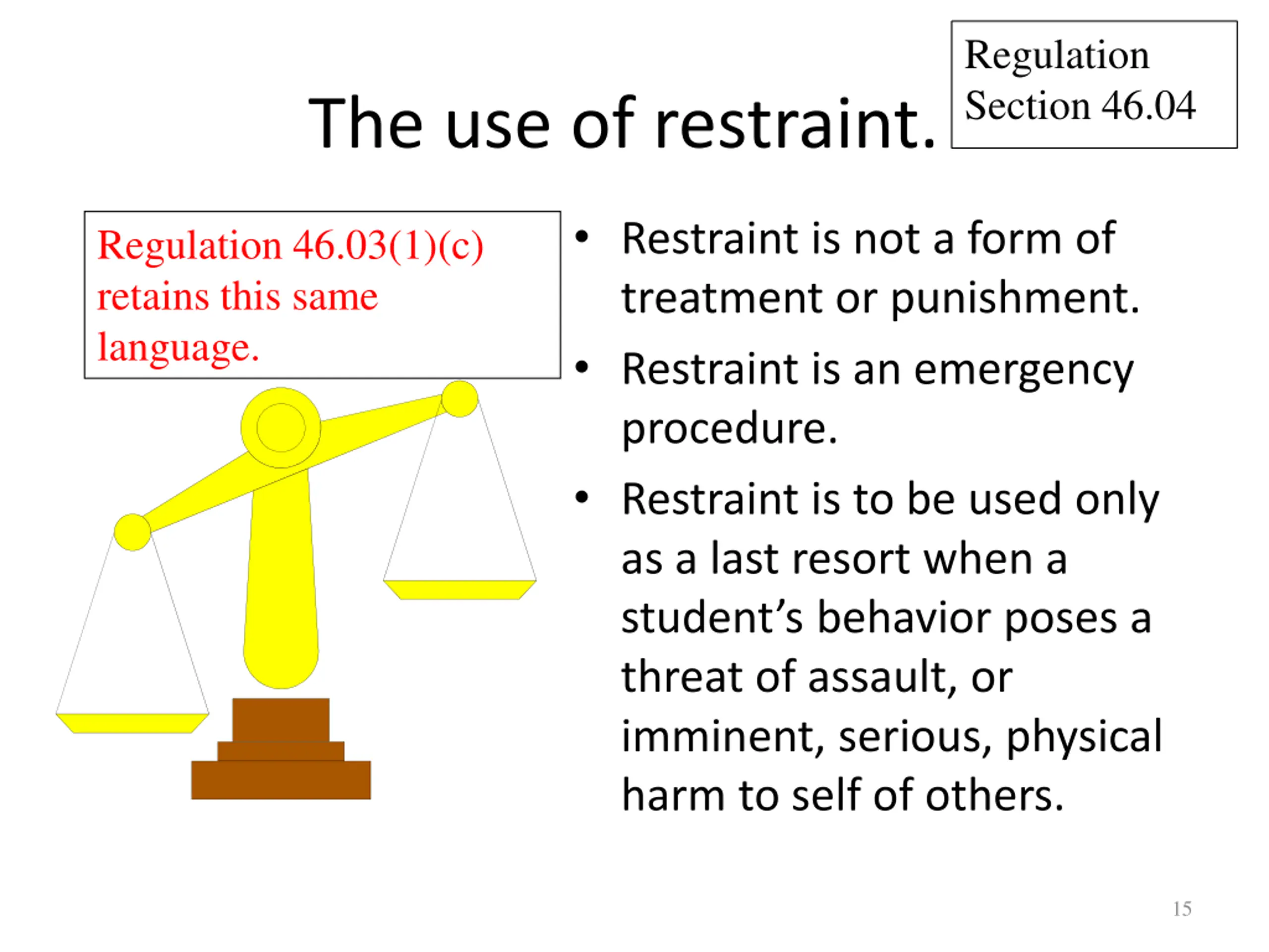 Regulation Section 46.04 The use of restraint. Restraint is not a form of treatment or punishment. Restraint is an emergency procedure. Restraint is to be used only as a last resort when a student s behavior poses a threat of assault, or imminent, serious, physical harm to self of others. Regulation 46.03(1)(c) retains this same language. 15