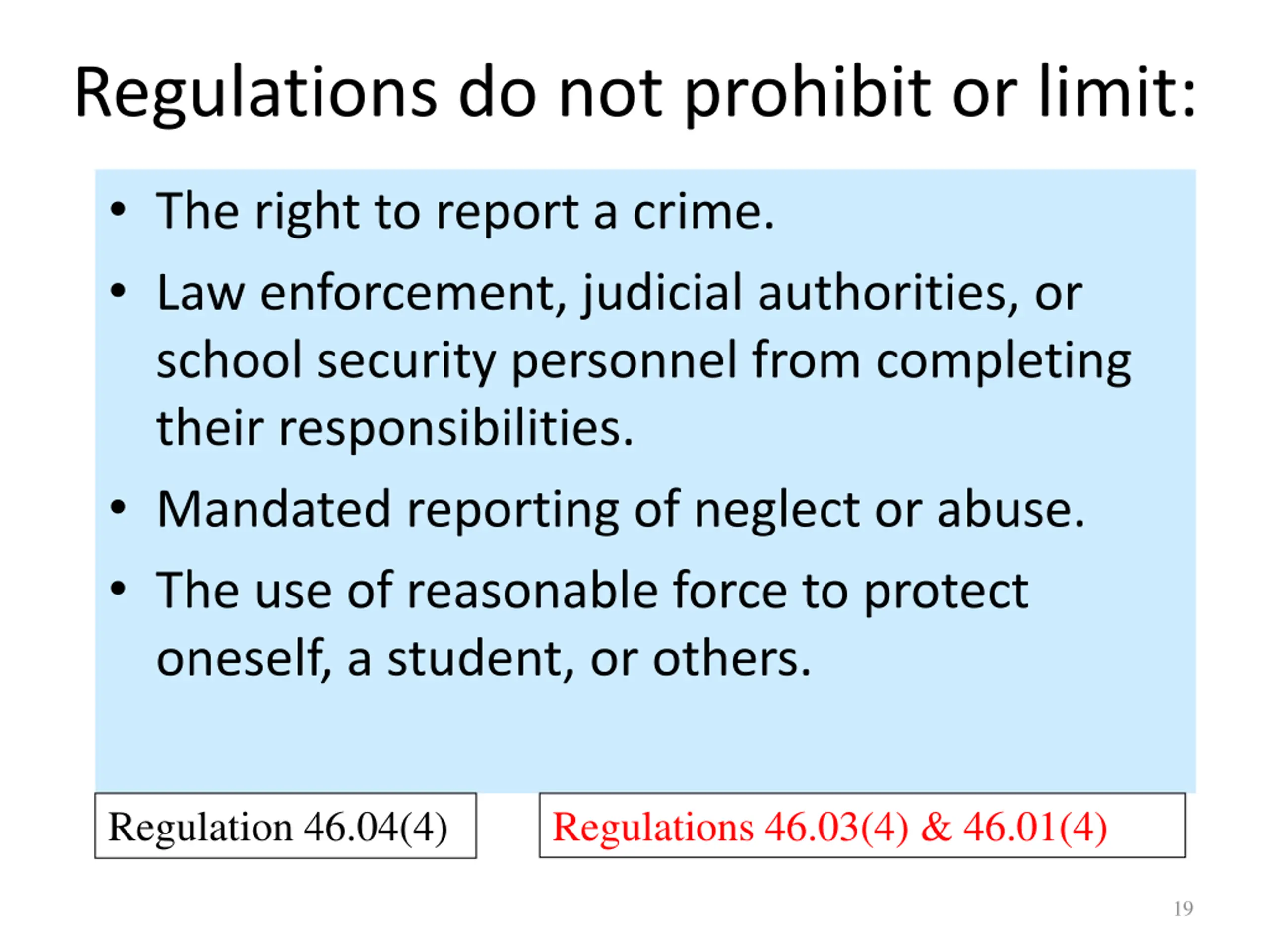 Regulations do not prohibit or limit: The right to report a crime. Law enforcement, judicial authorities, or school security personnel from completing their responsibilities. Mandated reporting of neglect or abuse. The use of reasonable force to protect oneself, a student, or others. Regulation 46.04(4) Regulations 46.03(4) & 46.01(4) 19