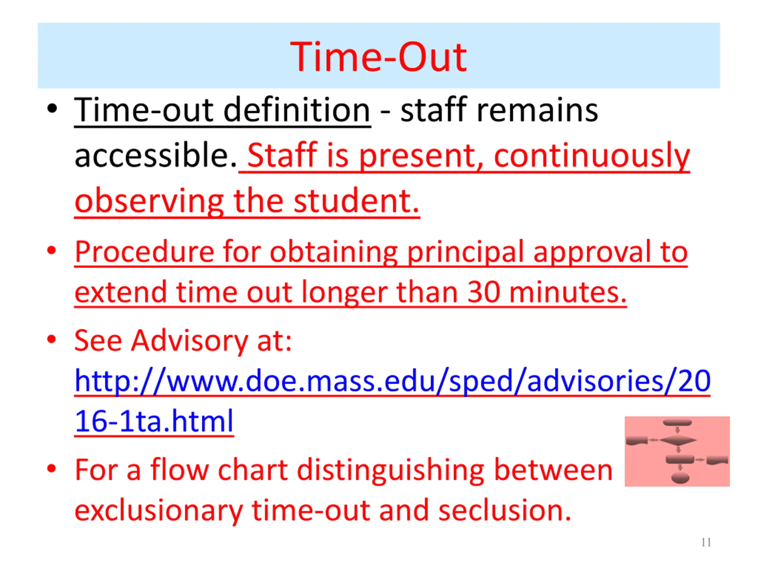 Time-Out Time-out definition - staff remains accessible. Staff is present, continuously observing the student. Procedure for obtaining principal approval to extend time out longer than 30 minutes. See Advisory at: http://www.doe.mass.edu/sped/advisories/20 16-1ta.html For a flow chart distinguishing between exclusionary time-out and seclusion. 11
