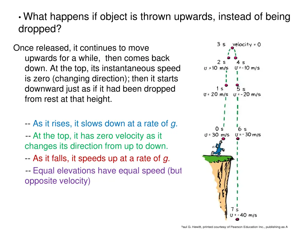 What happens if object is thrown upwards, instead of being dropped? Once released, it continues to move upwards for a while, then comes back down. At the top, its instantaneous speed is zero (changing direction); then it starts downward just as if it had been dropped from rest at that height. -- As it rises, it slows down at a rate of g. -- At the top, it has zero velocity as it changes its direction from up to down. -- As it falls, it speeds up at a rate of g. -- Equal elevations have equal speed (but opposite velocity)