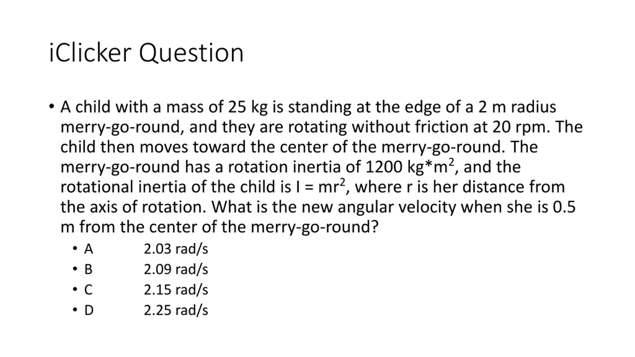 iClicker Question A child with a mass of 25 kg is standing at the edge of a 2 m radius merry-go-round, and they are rotating without friction at 20 rpm. The child then moves toward the center of the merry-go-round. The merry-go-round has a rotation inertia of 1200 kg*m2, and the rotational inertia of the child is I = mr2, where r is her distance from the axis of rotation. What is the new angular velocity when she is 0.5 m from the center of the merry-go-round? A 2.03 rad/s B 2.09 rad/s C 2.15 rad/s D 2.25 rad/s