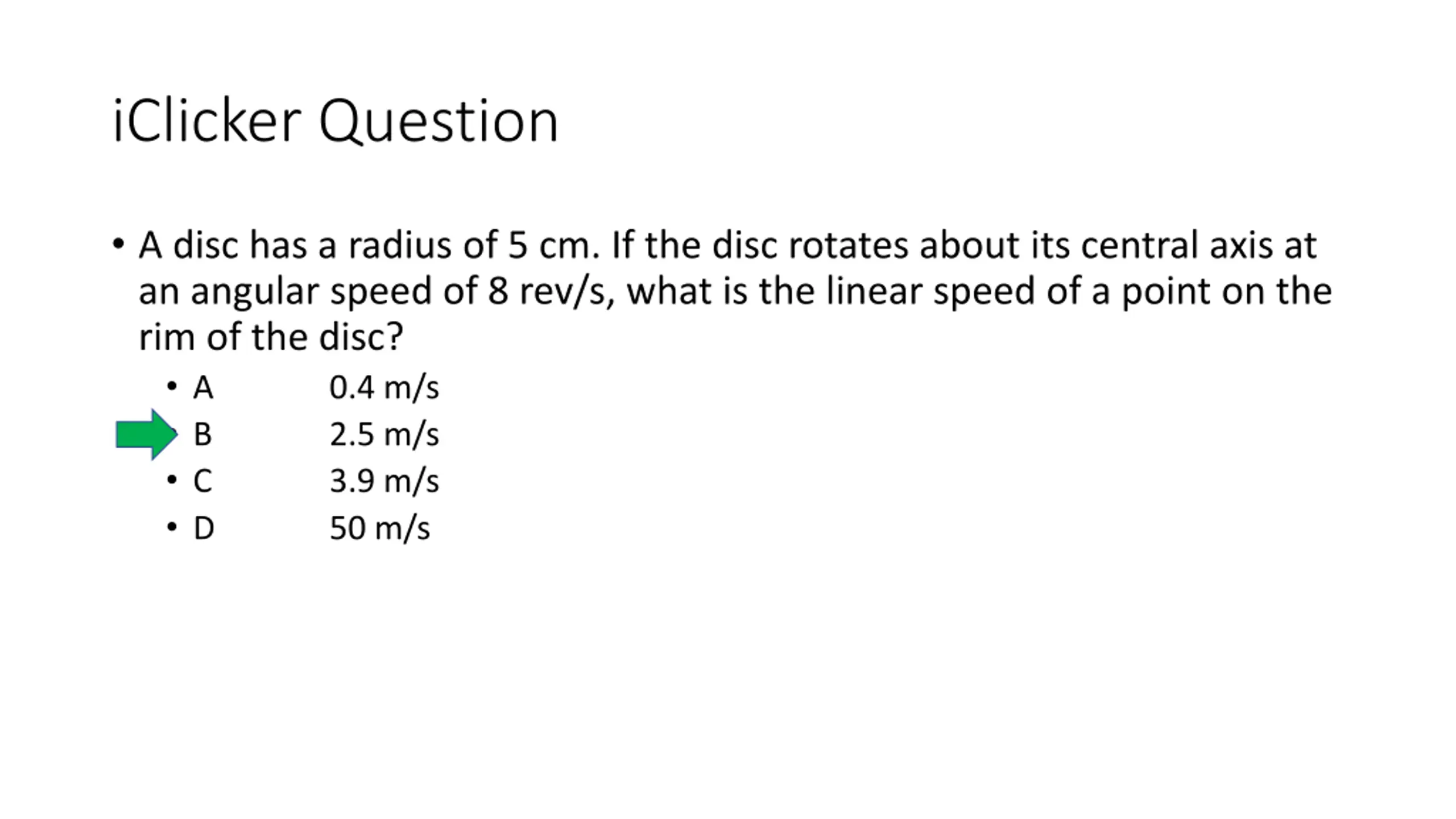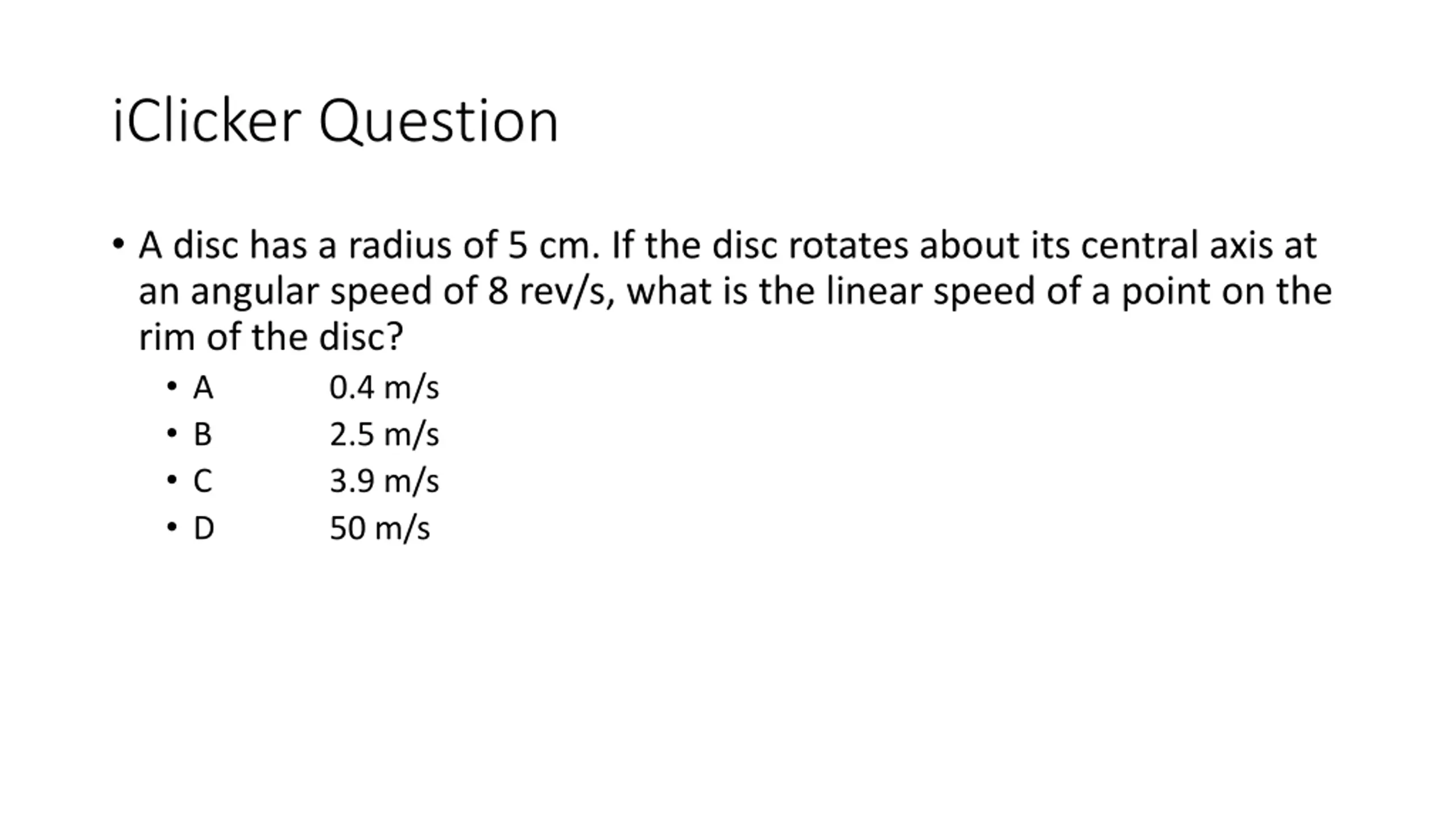 iClicker Question A disc has a radius of 5 cm. If the disc rotates about its central axis at an angular speed of 8 rev/s, what is the linear speed of a point on the rim of the disc? A 0.4 m/s B 2.5 m/s C 3.9 m/s D 50 m/s