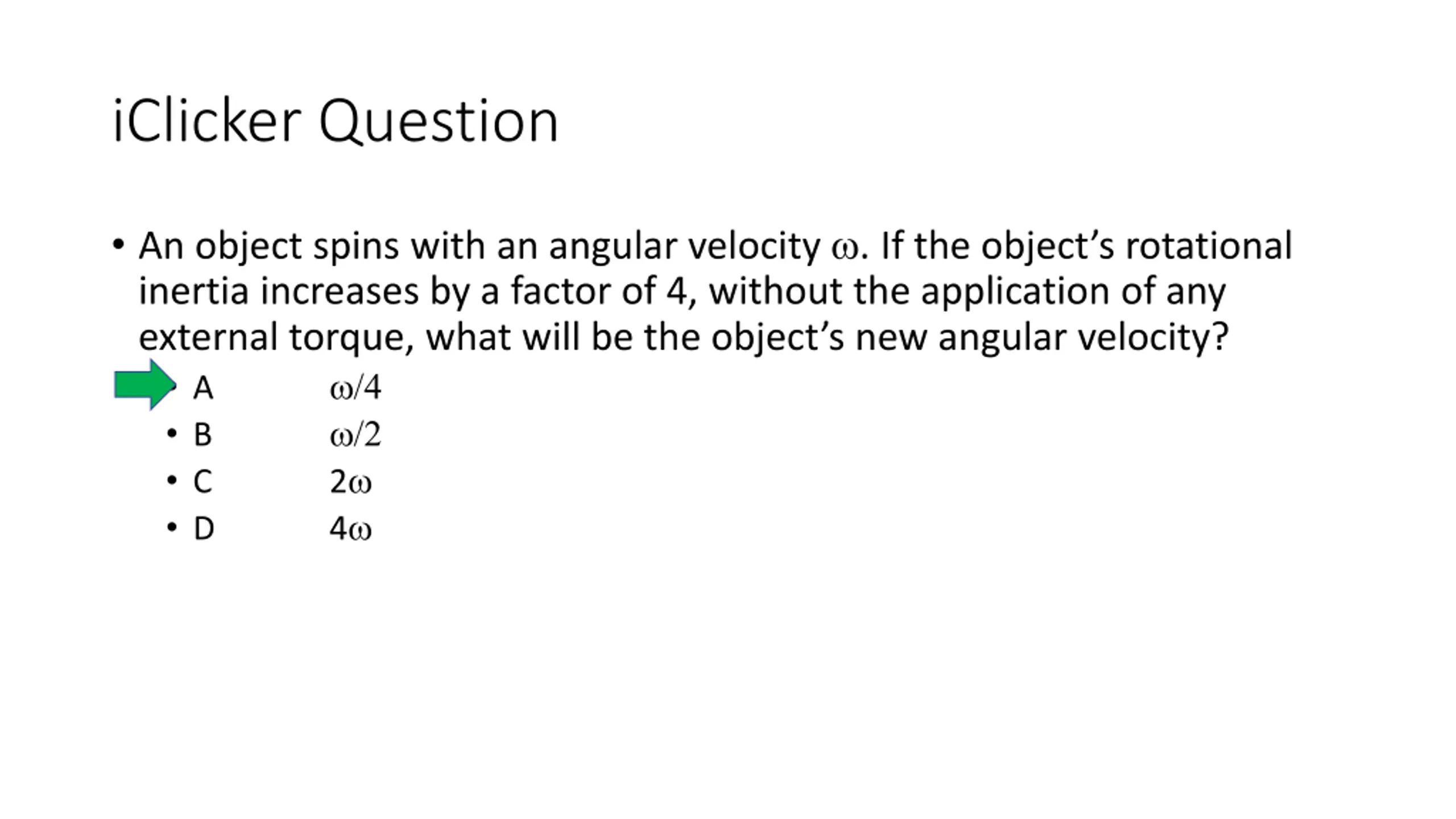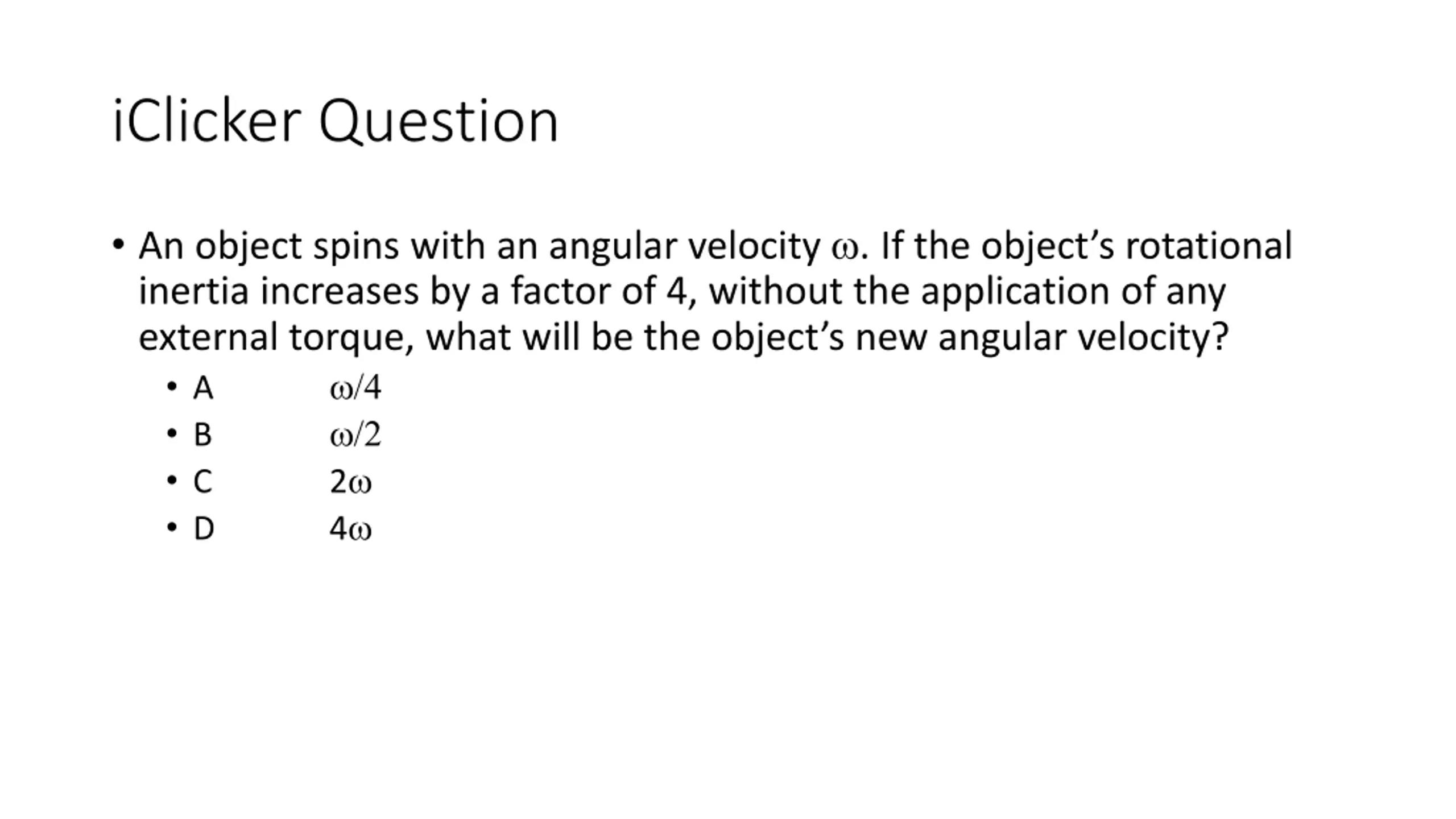 iClicker Question An object spins with an angular velocity . If the object s rotational inertia increases by a factor of 4, without the application of any external torque, what will be the object s new angular velocity? A B C 2 D 4