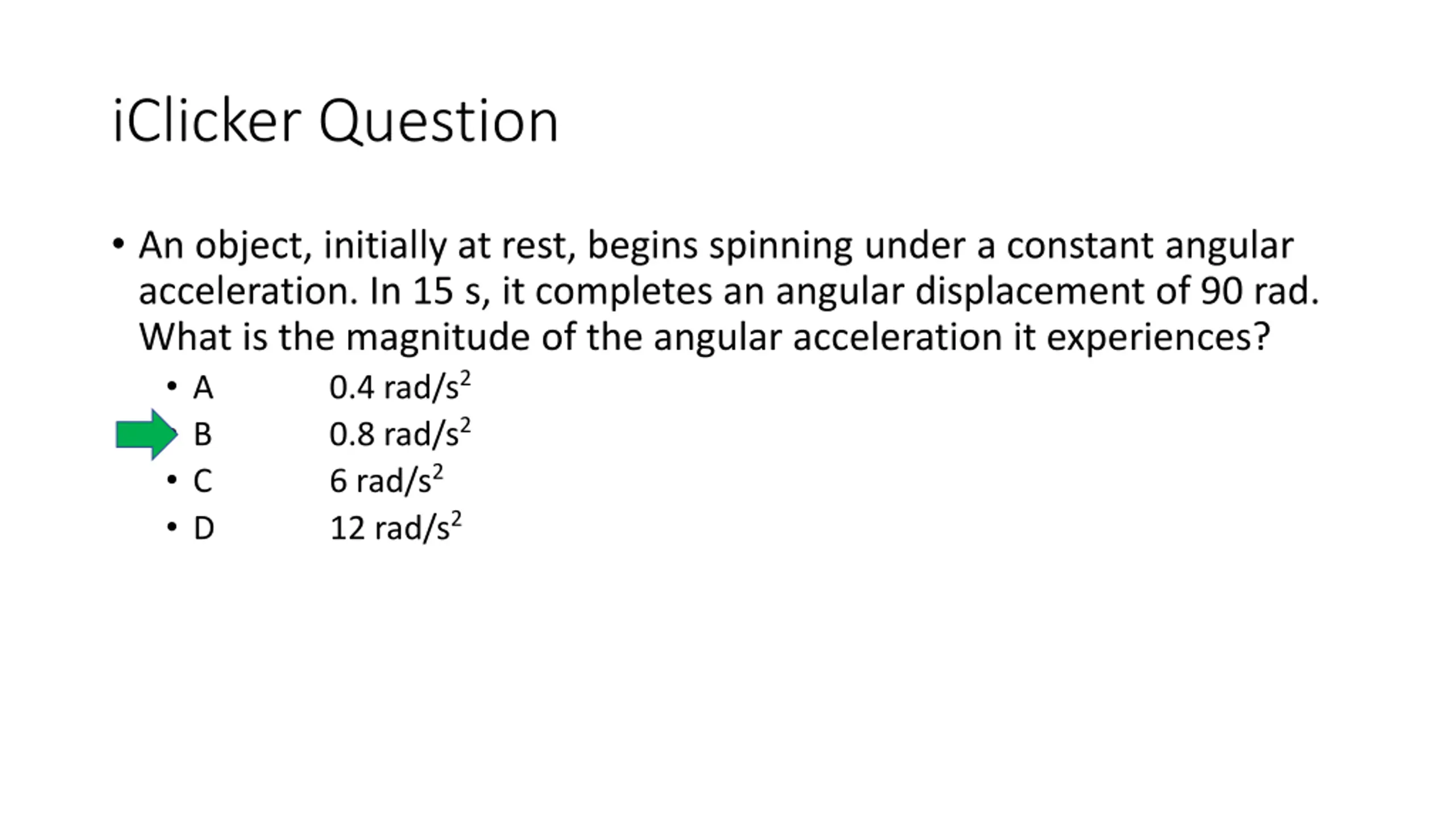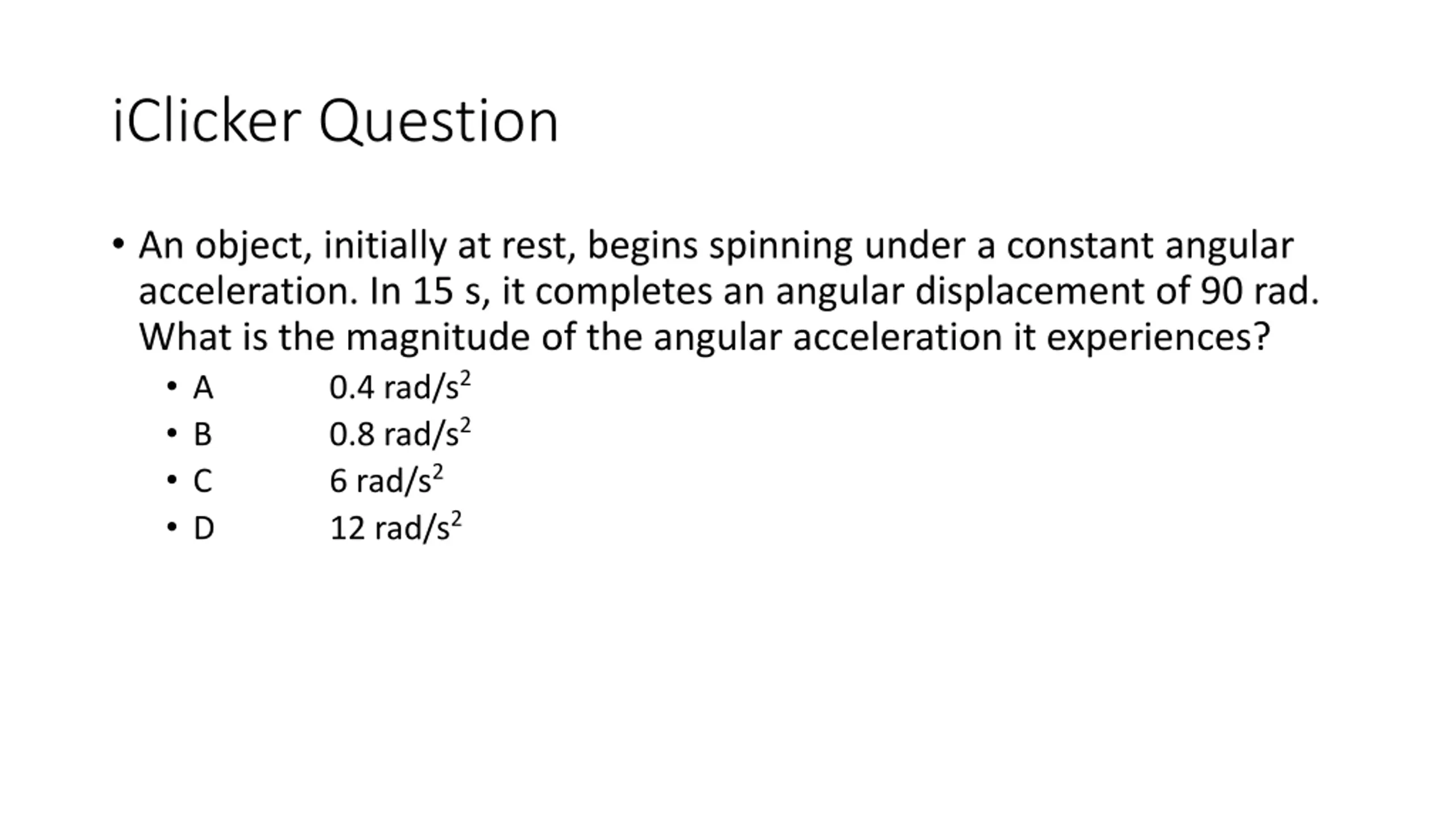 iClicker Question An object, initially at rest, begins spinning under a constant angular acceleration. In 15 s, it completes an angular displacement of 90 rad. What is the magnitude of the angular acceleration it experiences? A 0.4 rad/s2 B 0.8 rad/s2 C 6 rad/s2 D 12 rad/s2