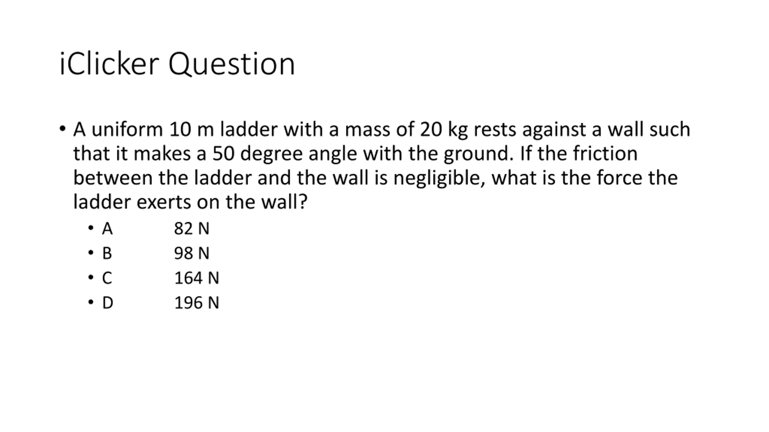 iClicker Question A uniform 10 m ladder with a mass of 20 kg rests against a wall such that it makes a 50 degree angle with the ground. If the friction between the ladder and the wall is negligible, what is the force the ladder exerts on the wall? A 82 N B 98 N C 164 N D 196 N